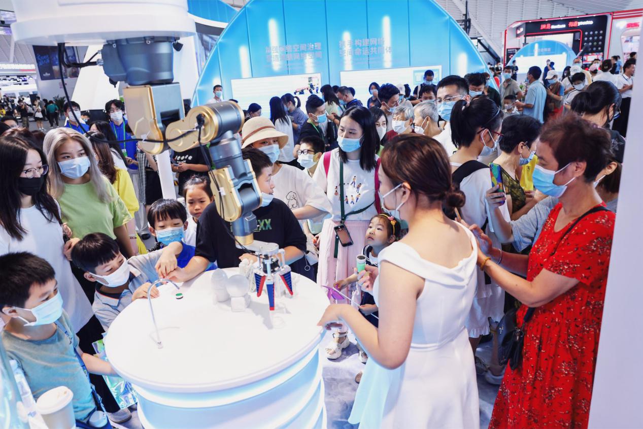 這牛奶和其他的不太一樣,很香濃。“離心精萃‘白科技’開啟臻濃新紀元”展臺一直就是博覽會現(xiàn)場的“人氣王”,這里以宇宙探索為主題,科幻感十足,火箭發(fā)動機噴出淡淡煙霧,三臺智能機械臂不停忙碌,人們排起長隊,品嘗由“離心精萃科技”現(xiàn)場調(diào)制的伊利臻濃牛奶。在這里,吸引觀眾的不僅是美味的伊利牛奶,也有滿滿的數(shù)字科技。