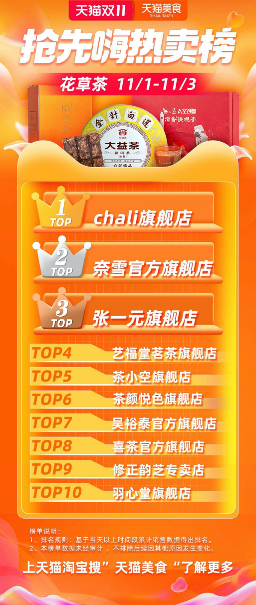 今年“雙11”電商購(gòu)物節(jié)比往年更早開啟,10月20日晚8點(diǎn)便拉開序幕,奈雪的茶隨之推出滿減、秒殺等多項(xiàng)優(yōu)惠活動(dòng)。奈雪此次雙11迎來(lái)開門紅,數(shù)據(jù)顯示,11月1日凌晨開售后僅10分鐘,奈雪的茶的銷售總額便突破去年全天。11月1日-3日,伴隨著茶禮盒等產(chǎn)品的熱銷,奈雪躋身花草茶銷售額排行榜TOP2。