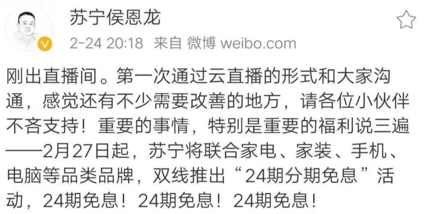 2月24日晚8點(diǎn),一場(chǎng)特殊的線上發(fā)布會(huì)在蘇寧矩陣直播平臺(tái)全面啟動(dòng)。蘇寧侯恩龍化身主播,宣布開啟一場(chǎng)公司復(fù)工與市場(chǎng)復(fù)蘇的“救市”行動(dòng),拉開家電銷售破局大幕。