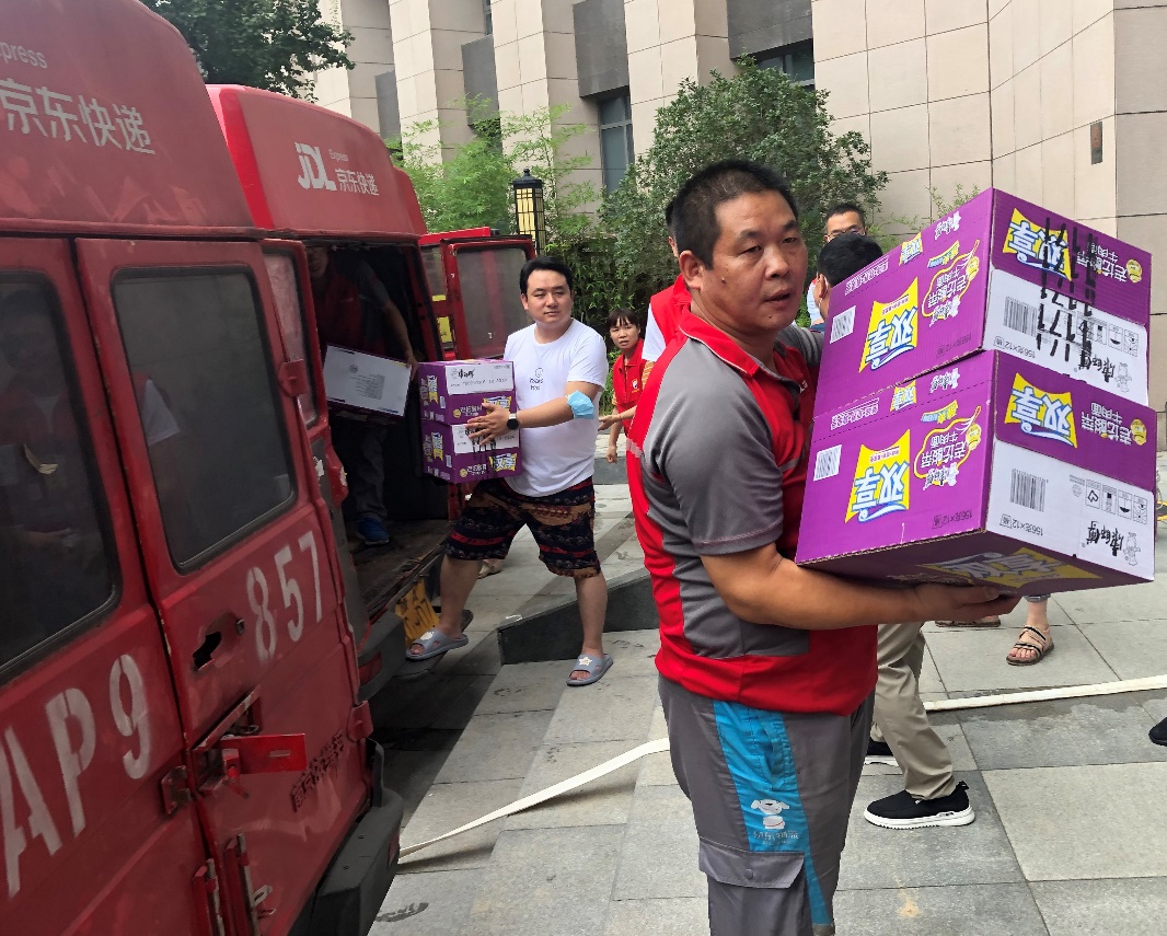 在河南汛情發(fā)生后,京東第一時間行動,緊急籌集、運送多批救援物資到達受災地點。