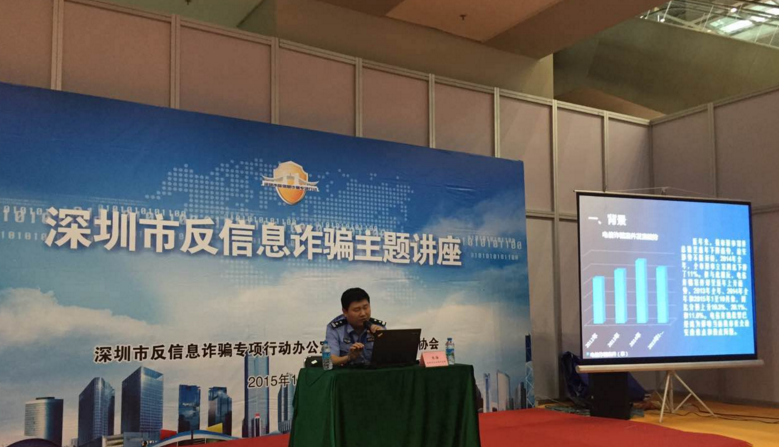 “針對(duì)信息詐騙犯罪高發(fā)的態(tài)勢,今年8月1日,我市開展以深圳市政法委書記李華楠同志為領(lǐng)導(dǎo)小組組長的反信息詐騙犯罪專項(xiàng)行動(dòng),為期半年。此次專項(xiàng)行動(dòng)主要集中公安、銀行、通信、工商、網(wǎng)絡(luò)企業(yè)等專業(yè)力量共同打擊信息詐騙犯罪。經(jīng)過合成打擊、宣傳防范、警信警銀合作、對(duì)策研究等多個(gè)方面的工作,8月1日至10月25日,全市共立信息詐騙案件環(huán)比下降了13.9%;破信息詐騙案件280宗,環(huán)比260宗上升了7.7%;逮捕涉信息詐騙犯罪嫌疑人190人,環(huán)比149人上升了27.5%;打掉涉信息詐騙犯罪團(tuán)伙19個(gè),環(huán)比19個(gè)持平;凍結(jié)涉案賬戶203個(gè),資金3089.9萬元?!鄙钲谑泄簿中虃删执箨?duì)長朱海在講座上分享道。