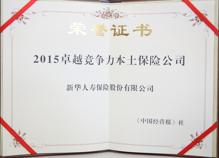 2015年12月,在由中國經(jīng)營報(bào)主辦的2015年度(第七屆)卓越競爭力金融機(jī)構(gòu)評選中,新華保險(xiǎn)獲得“2015卓越競爭力本土保險(xiǎn)公司”獎(jiǎng)。
