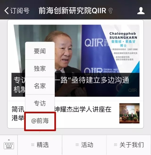 在“前海創(chuàng)新研究院QIIR”的底部菜單欄里找到“@前海”,就可進入以下頁面,從研究院放眼前海,獲得一手新鮮資訊。