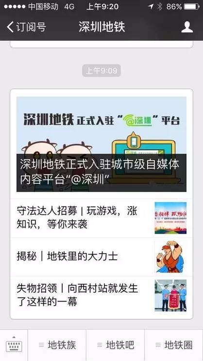 12月1日,深圳地鐵官方微信“深圳地鐵”正式入駐“@深圳”平臺。這是國內(nèi)首個城市級自媒體內(nèi)容平臺“@深圳”上線以來,又一入駐的官方微信。