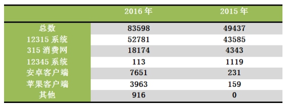 2016年,深圳市、區(qū)消委會共接受消費(fèi)者投訴83598宗,比2015年的49437宗增長了69.10%,為消費(fèi)者挽回?fù)p失2.1億元。其中,52781宗來源于12315系統(tǒng),占63.13%;“315消費(fèi)通”的網(wǎng)頁端、手機(jī)端、微信端已經(jīng)成為另一消費(fèi)者投訴主渠道,全年共接收消費(fèi)者投訴30552宗,占36.55%,比去年的9.57%提高了27%。如表1所示。