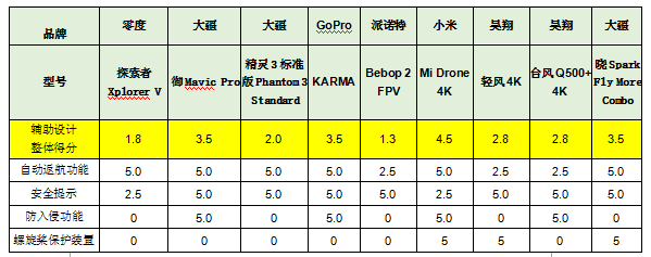 總評:小米“Mi Drone 4K”輔助設計表現(xiàn)最好,獲評4.5分。派諾特“Bebop 2 FPV”和零度“探索者Xplorer V”表現(xiàn)較差,僅獲評1.3分和1.8分。詳見下表。