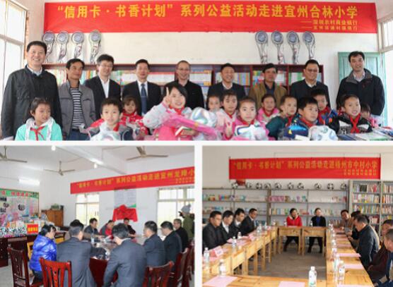 在2015年12月9日的信用卡發(fā)卡儀式上,深圳農(nóng)商行承諾客戶,持卡人每用深圳農(nóng)商行信用卡完成1筆交易,深圳農(nóng)商行就捐出0.1元,用于支援偏遠(yuǎn)貧困地區(qū)學(xué)校圖書室建設(shè)。涓涓細(xì)流,匯成大海,本次活動受到廣大客戶的踴躍參與和2016年,由深圳農(nóng)商行發(fā)起的“信用卡公益計(jì)劃·書香圖書室”捐贈活動,深入走進(jìn)廣西壯族自治區(qū)的偏遠(yuǎn)山區(qū),為當(dāng)?shù)剌^為貧困的學(xué)校學(xué)生送去溫暖。極支持。深圳農(nóng)商行“信用卡公益計(jì)劃·書香圖書室”活動的目標(biāo)是在全國建立100個(gè)圖書室,捐贈10萬冊圖書,希望能為孩子們的教育和成長貢獻(xiàn)一份力量。