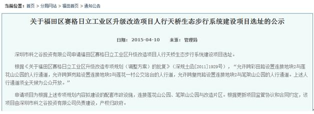 而據(jù)資料記載,市規(guī)土委曾經(jīng)在2015年4月10日,在福田管理局官網(wǎng)上發(fā)布了《關(guān)于福田區(qū)賽格日立工業(yè)區(qū)升級改造項目人行天橋生態(tài)步行系統(tǒng)建設(shè)項目選址的公示》,其中明確提到“根據(jù)《關(guān)于福田區(qū)賽格日立工業(yè)區(qū)升級改造專項規(guī)劃(調(diào)整方案)的批復(fù)》(深規(guī)土函[2011]1929號),‘允許跨彩田路設(shè)置連接地塊2與蓮花山公園的人行通道,允許跨筍崗路設(shè)置連接地塊2與蓮花一村公交站臺的人行道,允許跨皇崗路設(shè)置連接地塊2與筆架山公園的人行通道。上述人行通道須全天候為公眾開放’?!?/p>