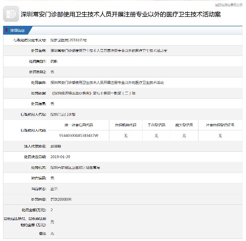 記者從羅湖區(qū)政府在線了解到,1月29日,羅湖區(qū)衛(wèi)生和計劃生育局對市民投訴的門診部已作處罰,處罰事由為,深圳常安門診部使用衛(wèi)生技術人員開展注冊專業(yè)外的醫(yī)療衛(wèi)生技術活動,罰款金額為20000元。與此同時,針對市民投訴違規(guī)行醫(yī)的醫(yī)生也作了處罰,處罰理由為,開展注冊專業(yè)以外的醫(yī)療衛(wèi)生技術活動,罰款金額為5000元。