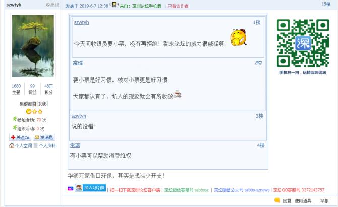 記者從問(wèn)政平臺(tái)得知,5月底以來(lái),還有市民發(fā)帖反映,除華潤(rùn)萬(wàn)家外,科技園萬(wàn)象天地華潤(rùn)Ole、僑香路沃爾瑪?shù)瘸幸泊嬖诓惶峁┘堎|(zhì)購(gòu)物小票的情況。目前,市民仍然普遍認(rèn)同超市應(yīng)主動(dòng)提供紙質(zhì)購(gòu)物小票,避免顧客被價(jià)格欺詐。有市民表示:“遇到最多的是優(yōu)惠打折,實(shí)際還是原價(jià)買單,這時(shí),手中有小票一目了然,不花冤枉錢?!边€有市民質(zhì)疑,“奸商,動(dòng)不動(dòng)就打著環(huán)保這些高大上的理由作借口”。同時(shí),也有市民體驗(yàn)過(guò)微信小票后表示,“沃爾瑪手機(jī)掃碼付款是沒有紙票,購(gòu)物小票藏在微信公眾號(hào)里,退換貨就在那里面進(jìn)行。這就是科技發(fā)達(dá)帶來(lái)的豐碩成果,挺好的?!苯刂劣浾甙l(fā)稿時(shí),市民關(guān)于科技園萬(wàn)象天地華潤(rùn)Ole、僑香路沃爾瑪?shù)瘸胁惶峁┵?gòu)物小票的帖文還沒有得到相關(guān)部門回應(yīng)。