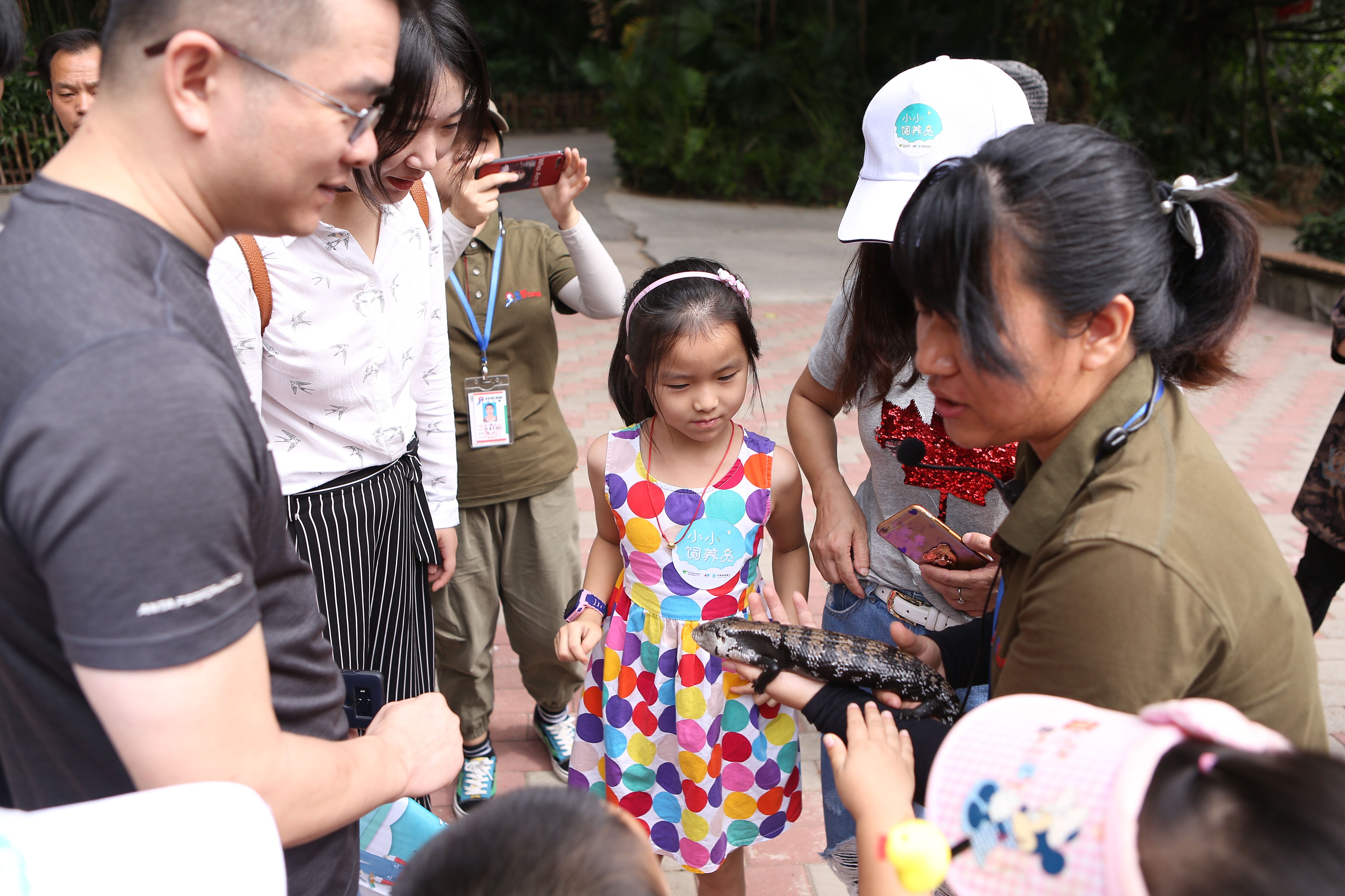 “鬃獅蜥和藍(lán)舌石龍子都是蜥蜴的一種。當(dāng)遭受威脅時,鬃獅蜥會張開嘴及將帶刺的咽喉膨起來像一頭生氣的獅子。藍(lán)舌石龍子的舌頭是藍(lán)色的,平時會不時向外一伸一伸?!毙∨笥褌冋J(rèn)真地聽科普導(dǎo)游講解兩種蜥蜴的區(qū)別,膽大的孩子則抱起蜥蜴仔細(xì)觀察起來。