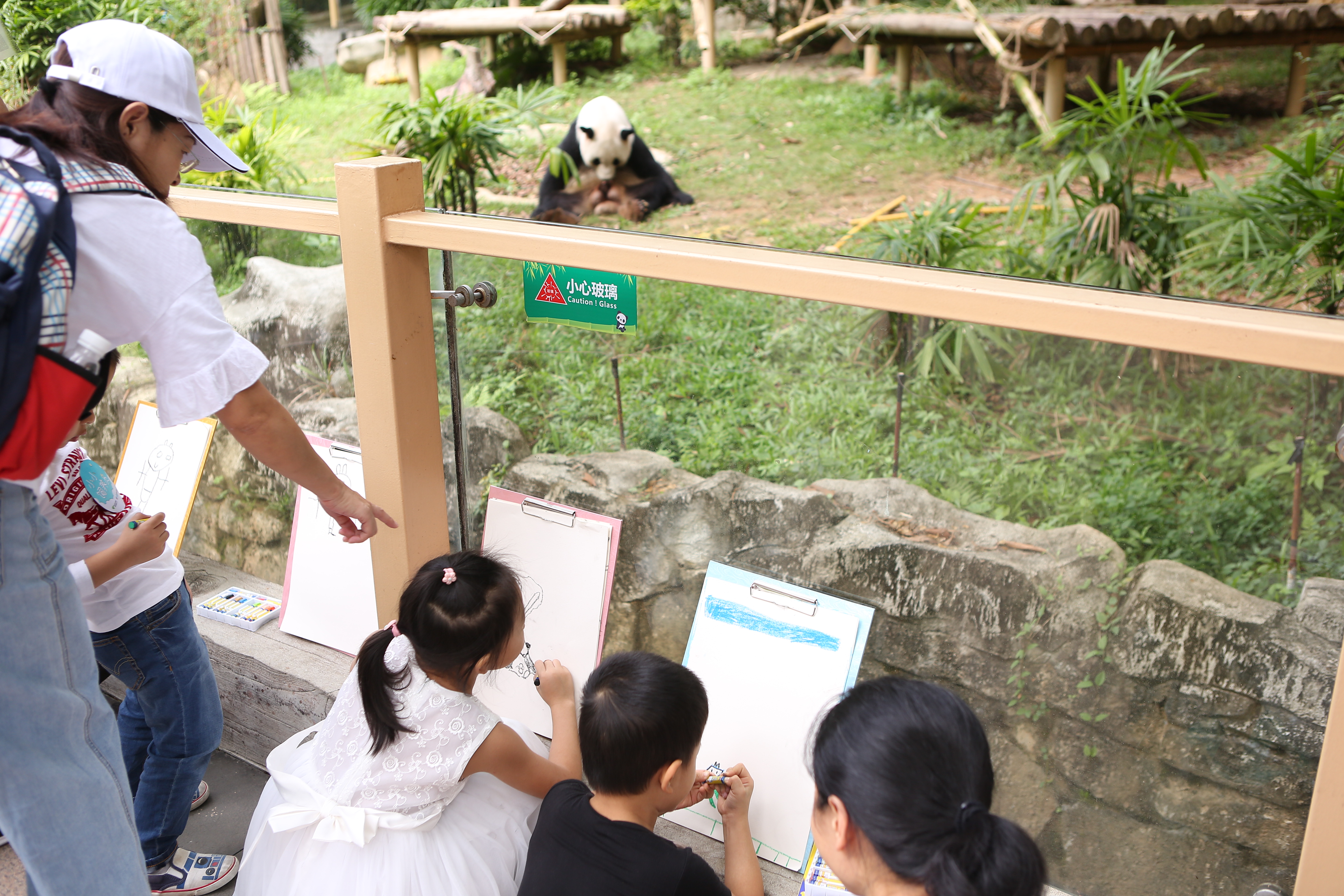猿猴村的后面,是國寶大熊貓的家——熊貓莊園。小朋友們來到這里,瞬間被大熊貓圓滾滾的萌態(tài)所吸引。他們或坐或站,拿起畫板,完成了從“小飼養(yǎng)員”到“小畫家”的角色轉(zhuǎn)變。在認(rèn)真觀察大熊貓后,小朋友們揮動手中的畫筆,將它們的萌態(tài)一一呈現(xiàn)在畫板上。