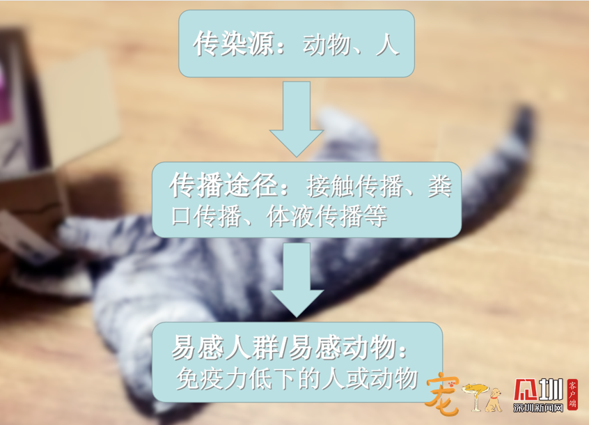 一般來說,人寵共患病可以分為3個(gè)基本環(huán)節(jié):傳染源、傳播途徑及易感人群(或易感動(dòng)物)。