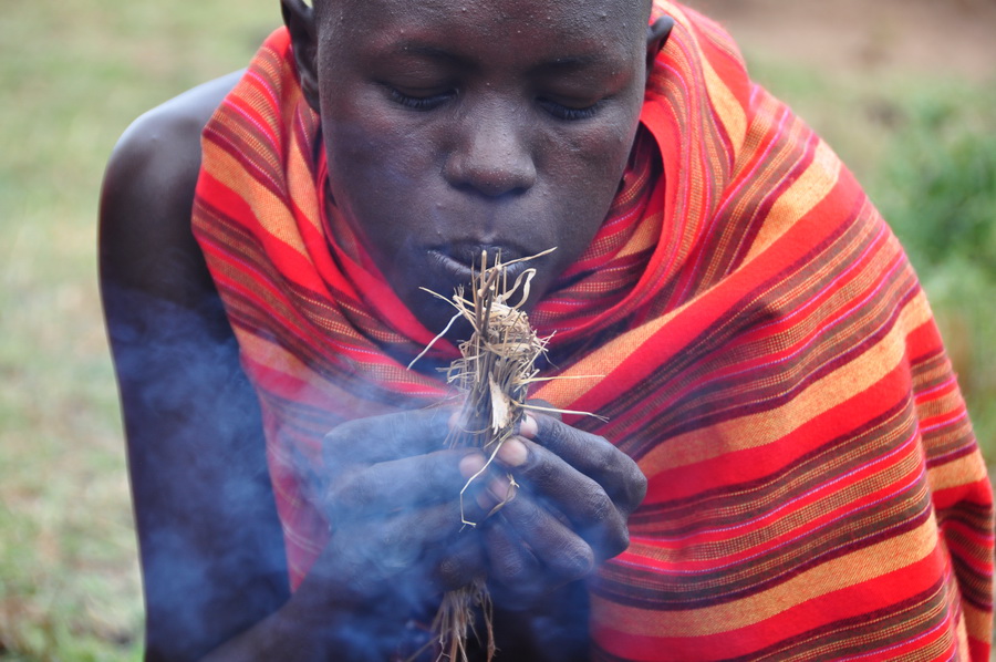 馬賽人盛行一夫多妻制。成年男子蓄發(fā)編成小辮,年輕婦女剃光頭。近年來,定居的馬賽兒童開始上學(xué),已出現(xiàn)少數(shù)馬賽人知識(shí)分子。圖為為游客表演鉆木取火等節(jié)目的馬賽人。李仁奇 攝