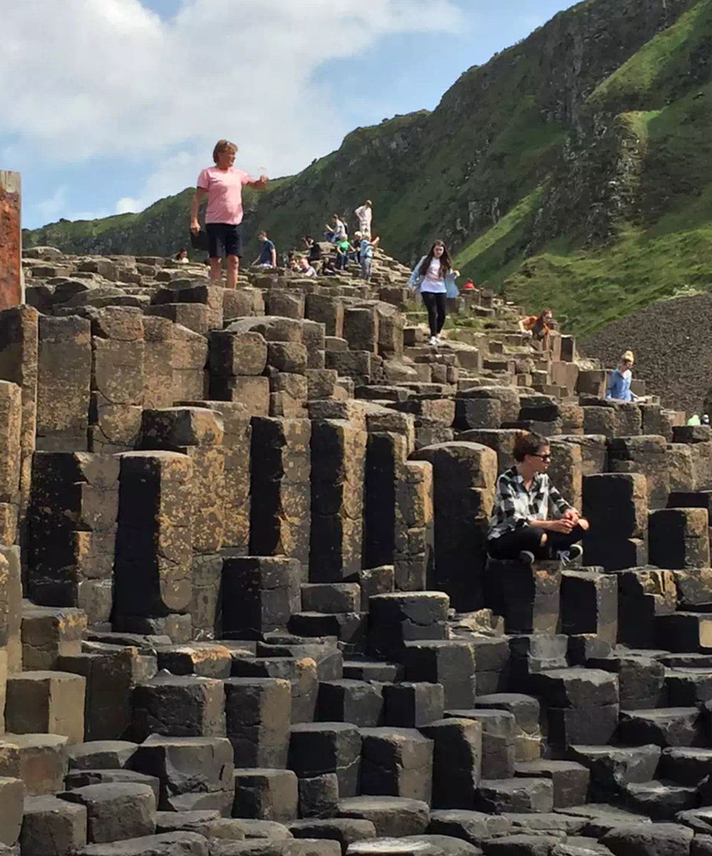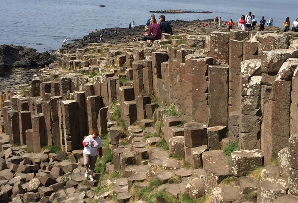 約五千萬年前,在今天蘇格蘭西部?jī)?nèi)赫布里底群島一線至北愛爾蘭東部火山非常活躍,一股股玄武巖巖熔流從裂隙的地殼中涌出,隨著灼熱的熔巖冷卻收縮,結(jié)晶的時(shí)候,開始爆裂呈規(guī)則的六邊形形態(tài)。李仁奇 攝