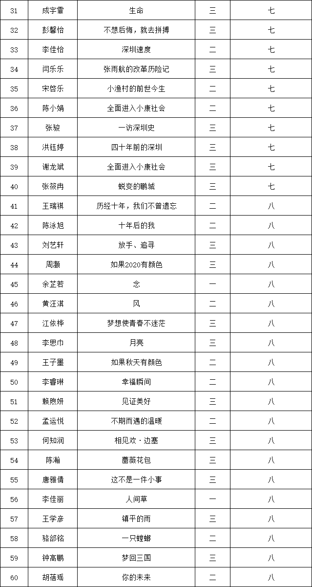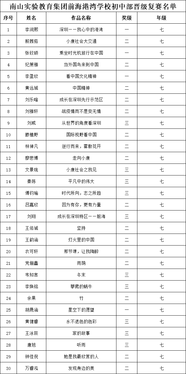 自2021年1月,活動征稿啟動以來,獲得了深圳市廣大中小學(xué)生、教師、文學(xué)愛好者的熱烈響應(yīng)積極參與,吸引了深圳百余所學(xué)校的上萬人關(guān)注報名?,F(xiàn)公布南山實驗教育集團前海港灣學(xué)校(初中部)專場晉級復(fù)賽名單如下: