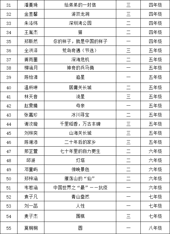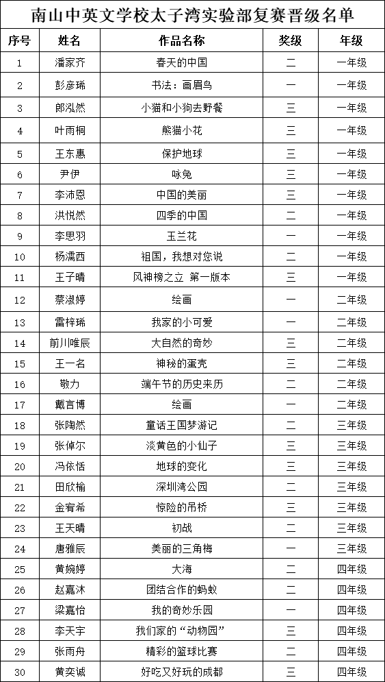 自2021年1月,活動(dòng)征稿啟動(dòng)以來(lái),獲得了深圳市廣大中小學(xué)生、教師、文學(xué)愛(ài)好者的熱烈響應(yīng)積極參與,吸引了深圳百余所學(xué)校的上萬(wàn)人關(guān)注報(bào)名?,F(xiàn)公布南山中英文學(xué)校太子灣實(shí)驗(yàn)部晉級(jí)復(fù)賽名單如下: