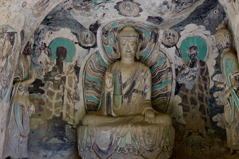 82窟,一結跏趺坐佛二脅侍菩薩,佛左右壁畫二弟子??唔敽烷T道露出底層,為北周原作,表層壁畫為明代重繪。李仁奇 攝