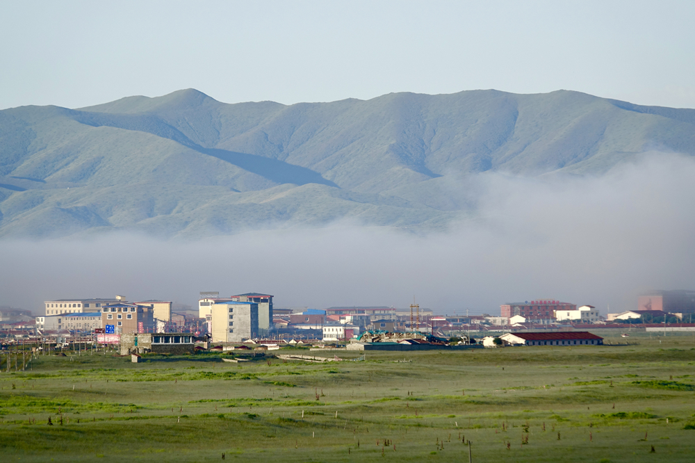 往白河方向遠(yuǎn)眺,群山煙霧繚繞,如夢(mèng)似幻;山下索克藏寺,沐浴晨光。航拍圖,郭國(guó)政 攝