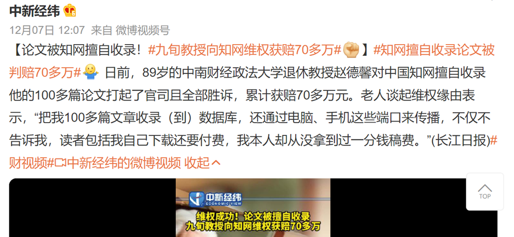 10.【法治事件】89歲退休法學教授趙德馨,從中國知網(wǎng)那里討回了自己160多篇稿件70多萬元元的收入,成為目前已知第一個向中國知網(wǎng)維權成功的勝訴案例。