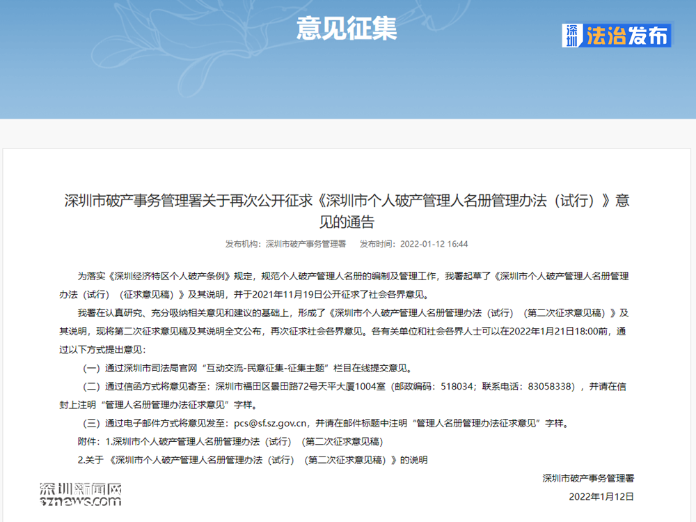 讀特客戶端?深圳新聞網(wǎng)2022年1月18日訊(記者 張玲)日前,深圳市破產(chǎn)事務(wù)管理署在深圳市司法局發(fā)布通告,面向社會(huì)征集《深圳市個(gè)人破產(chǎn)管理人名冊(cè)管理辦法(試行)》(以下簡(jiǎn)稱管理辦法)的意見(jiàn),有意提交者可在2022年1月21日18時(shí)前提交。