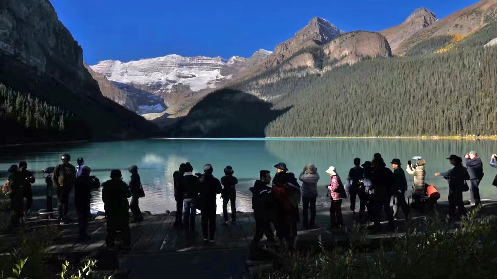 露易斯湖源自維多利亞冰川,湖水碧綠清澈,遠望就像鑲嵌在落基山脈中的一顆翡翠。李仁奇 攝