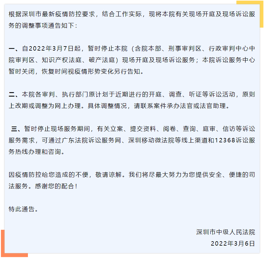 讀特客戶端·深圳新聞網(wǎng)2022年3月7日訊(記者 張玲)3月6日夜間,深圳市中級人民法院發(fā)布通告,從2022年3月7日開始暫?,F(xiàn)場開庭及現(xiàn)場訴訟服務(wù),訴訟服務(wù)中心也暫時關(guān)閉,恢復(fù)時間另行告知。