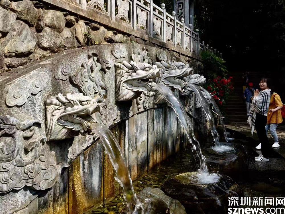 景區(qū)在蝴蝶泉出水口處修葺了五龍池,五股清泉從龍頭噴涌而下,形成一個(gè)五龍吐水、浪花飛濺的景觀。李仁奇 攝