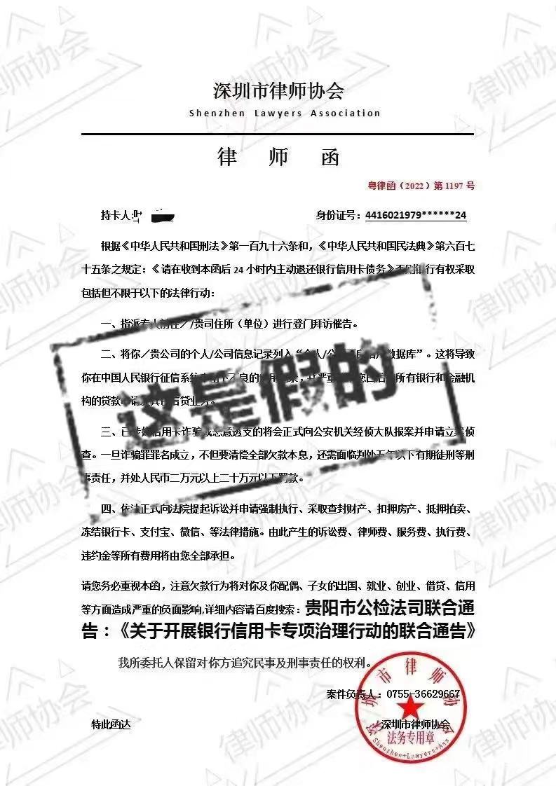 讀特客戶(hù)端·深圳新聞網(wǎng)2022年10月10日訊(記者 翁任瑩 張玲)近日,有人假冒“深圳市律師協(xié)會(huì)”名義發(fā)出催收信用卡債務(wù)的所謂“律師函”,并蓋上“深圳市律師協(xié)會(huì)”法務(wù)專(zhuān)用章。
