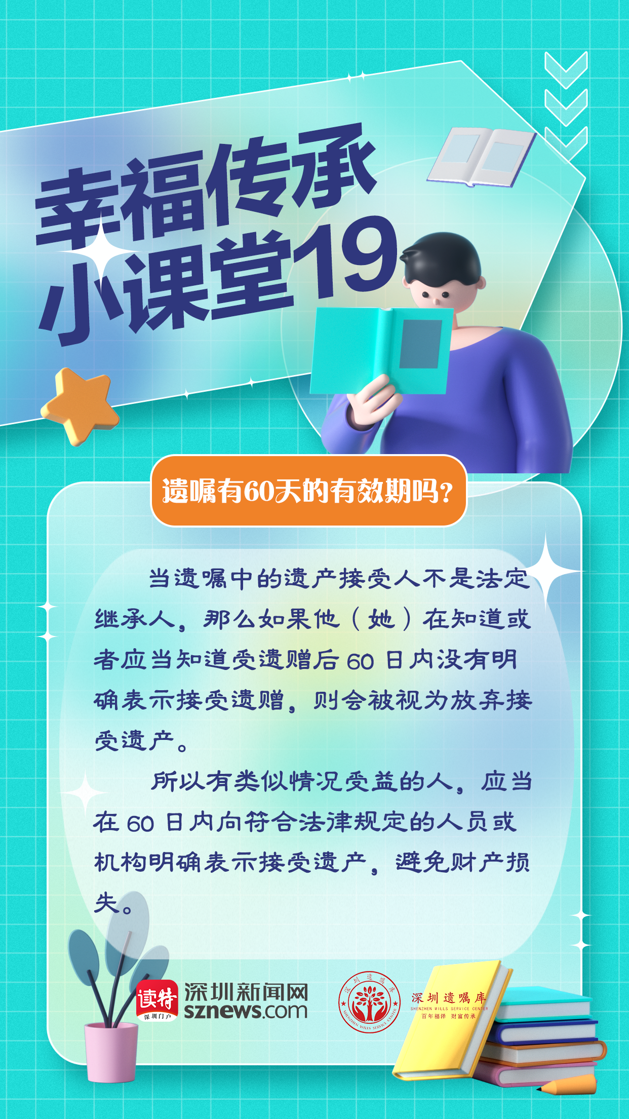 讀特客戶端·深圳新聞網(wǎng)2022年11月14日訊(記者 張玲 翁任瑩)遺囑是有有效期的,60天。當(dāng)遺囑中的遺產(chǎn)接受人不是法定繼承人,那么在他(她)知道或者應(yīng)當(dāng)知道受遺贈(zèng)后60日內(nèi)沒(méi)有明確表示接受遺贈(zèng),則會(huì)被視為放棄接受遺產(chǎn)。