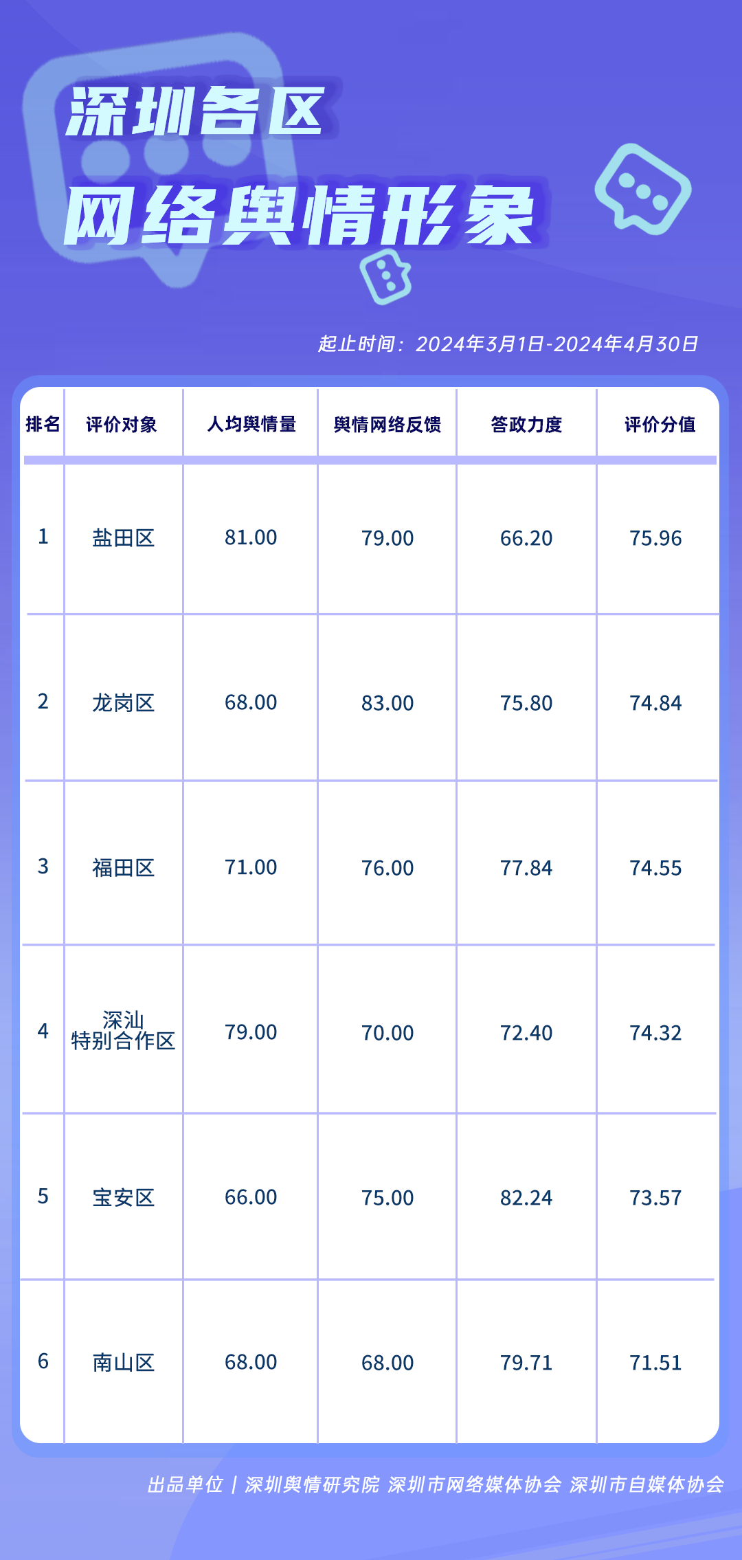 3-4月,福田區(qū)、龍崗區(qū)、南山區(qū)、鹽田區(qū)、大鵬新區(qū)、深汕特別合作區(qū)的網(wǎng)絡形象建設工作頗具成效,依次登上《深圳各區(qū)網(wǎng)絡形象建設榜》。其中,福田區(qū)榮登榜首,綜合形象得分為81.95分,且新媒體傳播形象得分達96.33分,展現(xiàn)出其以新媒體形象塑造為著力點,推進綜合網(wǎng)絡形象建設工作的一面。緊隨其后的是龍崗區(qū),綜合形象得分接近80分,整體表現(xiàn)領先于其他多區(qū),說明龍崗區(qū)在完善基層治理體系、維護良好網(wǎng)絡口碑等方面作出了較大努力。居于榜單第三至六名的南山區(qū)、鹽田區(qū)、大鵬新區(qū)和深汕特別合作區(qū),在網(wǎng)絡形象建立及優(yōu)化方面也具有可圈可點的表現(xiàn),如鹽田區(qū)積極完善民生保障制度,賦能群眾美好生活,提升群眾的社會生活滿意度,南山區(qū)則借力政務新媒體矩陣,持續(xù)深化政務信息傳播工作,擴大新媒體矩陣影響力。