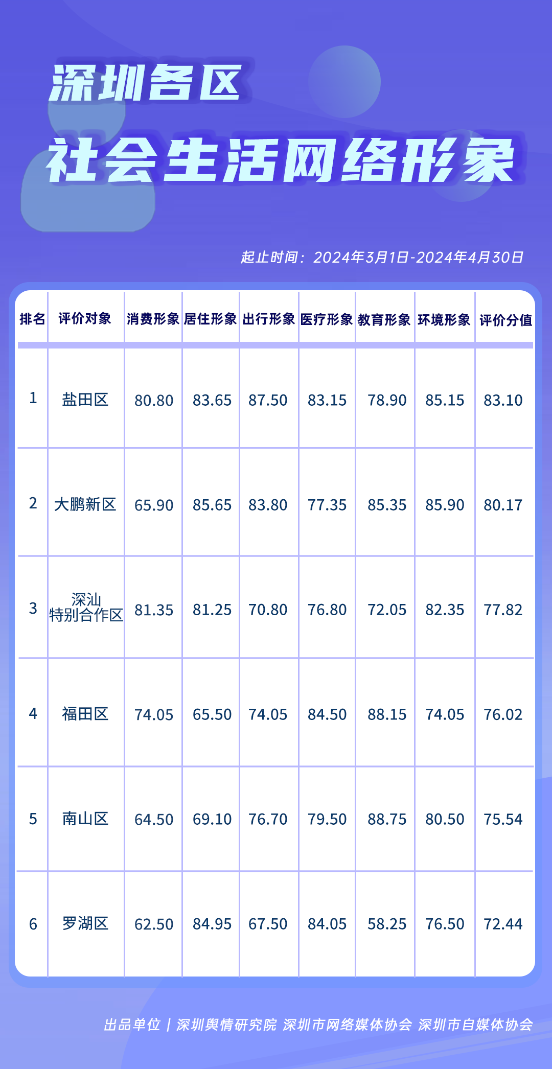 3-4月《深圳各區(qū)社會生活網(wǎng)絡形象榜》顯示,位居榜單第一名的鹽田區(qū),評價分值為83.10分,且消費、居住、出行、醫(yī)療和環(huán)境形象方面均高于80分,整體社會生活網(wǎng)絡形象較佳。緊隨其后的大鵬新區(qū)在居住、教育和環(huán)境形象建設方面,取得的分數(shù)都高于85分,表明該區(qū)在打造優(yōu)美宜居生活環(huán)境過程中收獲了較好反饋。位列第三的深汕特別合作區(qū),在消費、居住、環(huán)境形象方面表現(xiàn)也相對較好,得分均在80分以上,助推其社會生活網(wǎng)絡形象綜合得分走高。福田區(qū)、南山區(qū)、羅湖區(qū)分別占據(jù)了榜單第四,第五和第六的位置,評價分值依次為76.02分、75.54分、72.44分,綜合水平良好,后續(xù)若能充分發(fā)揮優(yōu)勢,著力補齊短板,排名有望持續(xù)提升。