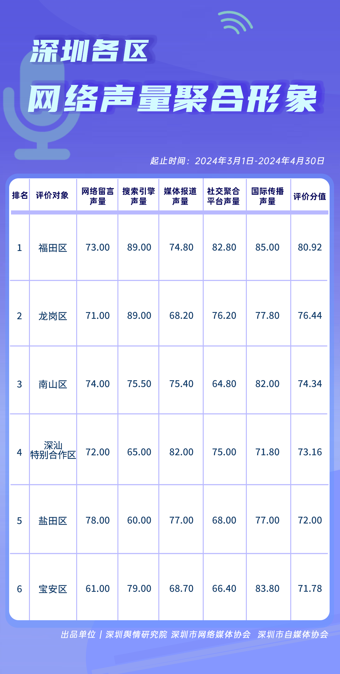 為全面評估深圳各區(qū)各單位網(wǎng)絡形象建設情況,助力各區(qū)各單位持續(xù)響應居民對美好生活的期許,賦能城市高質量發(fā)展,深圳輿情研究院、深圳市網(wǎng)絡媒體協(xié)會、深圳市自媒體協(xié)會聯(lián)合推出“深圳各區(qū)各單位網(wǎng)絡形象建設榜”,從網(wǎng)絡聚合聲量、留言互動成效、社會生活評價、輿情管理能力及新媒體傳播水平等方面,多維度分析深圳各區(qū)(含大鵬新區(qū)、深汕特別合作區(qū))、各市直單位(市直屬單位、直屬部門)的網(wǎng)絡形象建設成果,凸顯各區(qū)各單位的“共性”與“個性”。