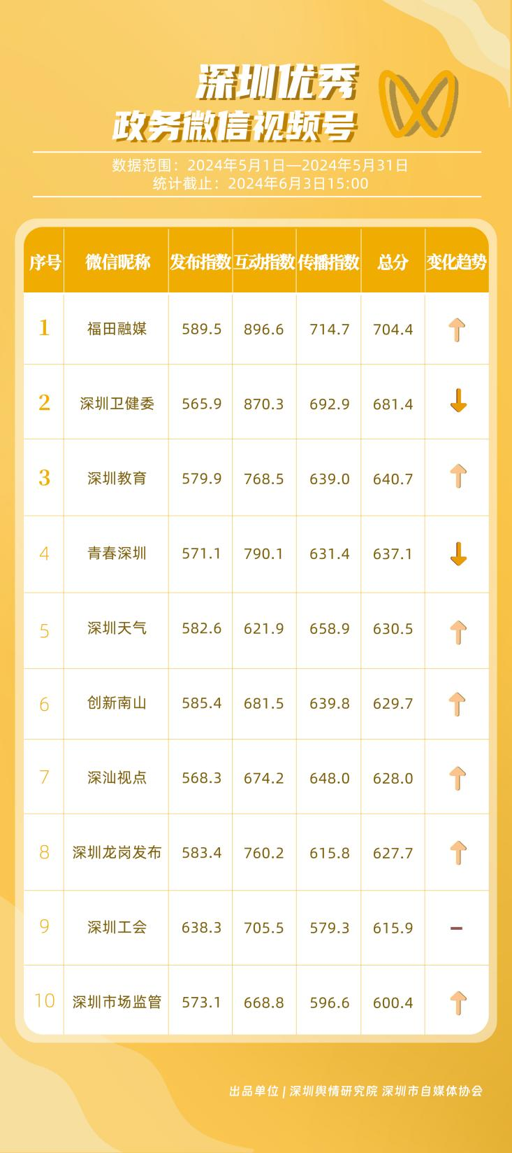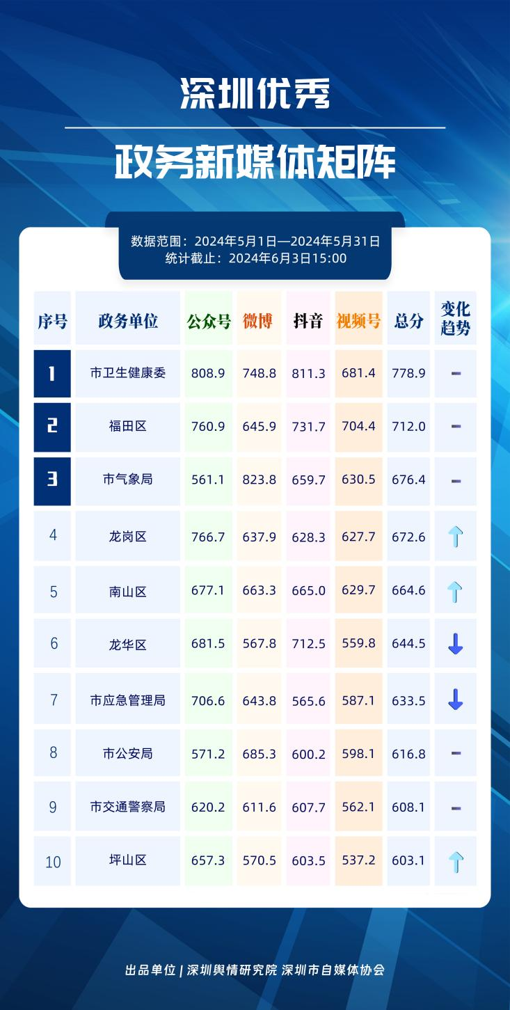 榜單在持續(xù)展示深圳政務(wù)新媒體矩陣建設(shè)成效的同時,梳理總結(jié)了深圳政務(wù)微信公眾號、微信視頻號、微博號、抖音號、頭條號的運營方法與經(jīng)驗,是政務(wù)公開、回應(yīng)群眾關(guān)切的重要載體。5月,哪些政務(wù)新媒體在本期深受好評,榮登榜單?《深圳優(yōu)秀政務(wù)新媒體矩陣》(2024年5月期)邀您共同關(guān)注。