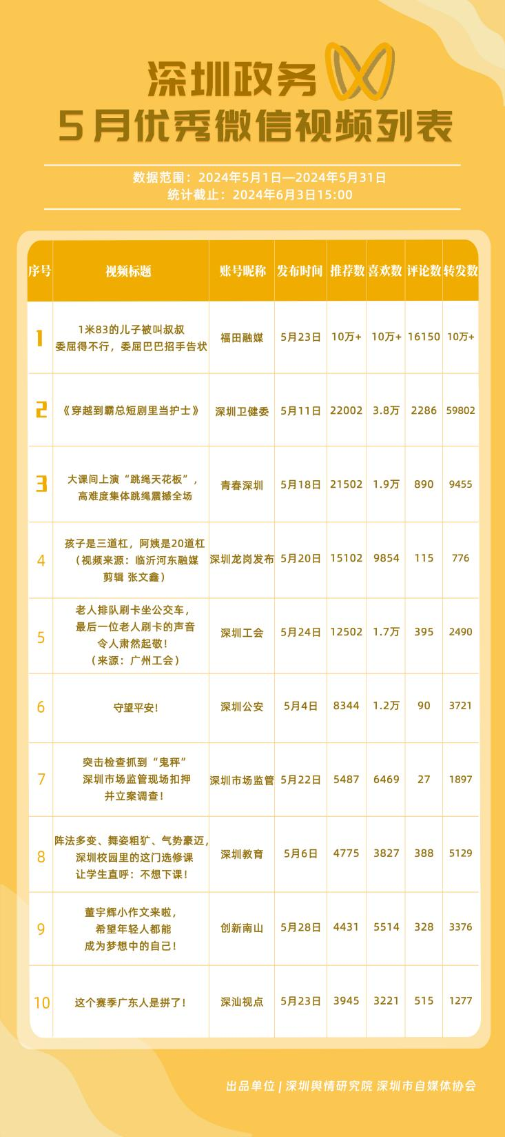 5月,政務(wù)微信視頻號“福田融媒”“深圳衛(wèi)健委”“深圳教育”“青春深圳”“深圳天氣”“創(chuàng)新南山”“深汕觀點”“深圳龍崗發(fā)布”“深圳工會”和“深圳市場監(jiān)管”入選“深圳優(yōu)秀政務(wù)微信視頻號”,以上上榜單位都能夠在持續(xù)發(fā)揮政務(wù)單位主體功能的同時,穩(wěn)定輸出觀眾所需的優(yōu)質(zhì)內(nèi)容。結(jié)合整體數(shù)據(jù)來看,5月深圳政務(wù)視頻號平臺內(nèi)容百花齊放,出現(xiàn)多個優(yōu)質(zhì)、熱門作品,如《1米83的兒子被叫叔叔委屈得不行,委屈巴巴招手告狀》《穿越到霸總短劇里當(dāng)護士》等,是各上榜單位積極探索政務(wù)新媒體正能量傳播機制的良好體現(xiàn)。