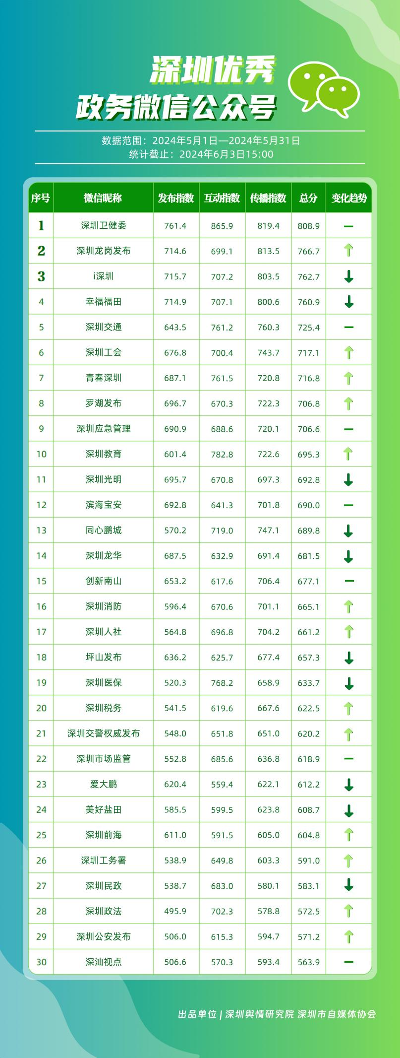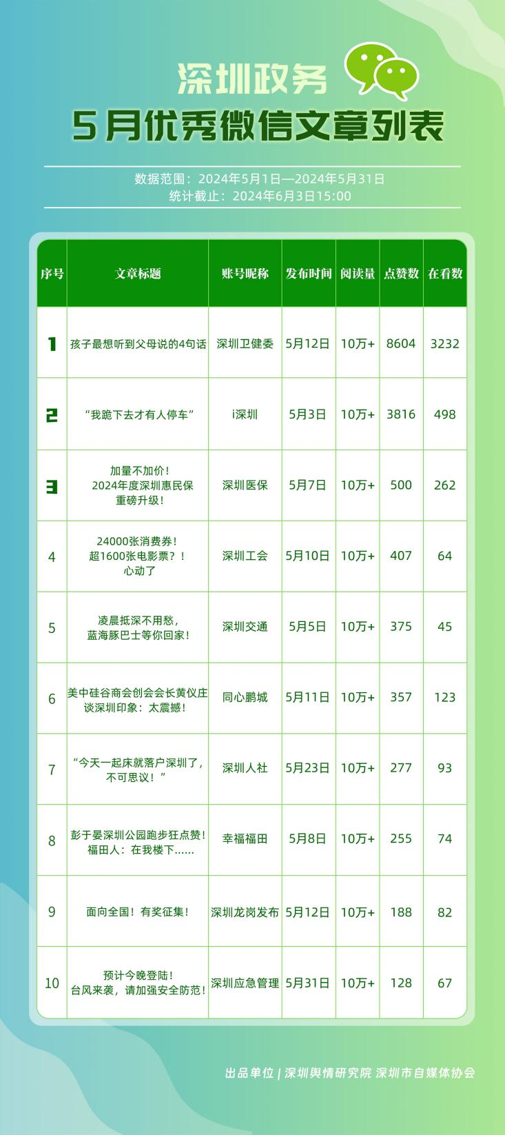 5月,“深圳衛(wèi)健委”“深圳龍崗發(fā)布”“i深圳”“幸福福田”“深圳交通”“深圳工會”“青春深圳”“羅湖發(fā)布”“深圳應(yīng)急管理”“深圳教育”等30個政務(wù)微信公眾號,被評為“深圳優(yōu)秀政務(wù)微信公眾號”。5月,“深圳衛(wèi)健委”憑借精心創(chuàng)作的內(nèi)容、與受眾深入互動,多篇作品深受好評,榮登榜單首位?!吧钲邶垗彴l(fā)布”“i深圳”“幸福福田”“深圳交通”等上榜公眾號也積極捕捉觀眾優(yōu)質(zhì)作品需求,把握主流熱點趨勢,集中發(fā)揮政務(wù)媒體傳播力量,在本期也取得了較為亮眼的成績,進(jìn)一步推動了政務(wù)信息傳播工作提質(zhì)增效。