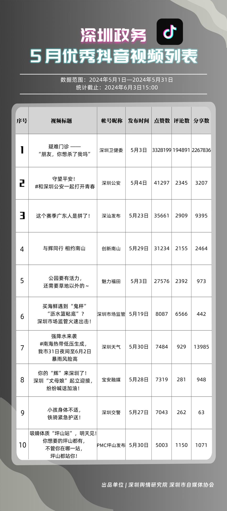 5月,共有10個政務(wù)抖音號獲得“深圳優(yōu)秀政務(wù)抖音號”稱號,分別是“深圳衛(wèi)健委”“魅力福田”“DOU愛龍華”“創(chuàng)新南山”“深圳天氣”“深汕發(fā)布”“掌上龍崗”“深圳交警”“PMC坪山發(fā)布”和“深圳公安”,多個政務(wù)抖音號能夠把握短視頻平臺宣傳要領(lǐng),持續(xù)發(fā)布優(yōu)質(zhì)信息內(nèi)容,做到了政務(wù)便民化、政務(wù)信息傳播高效化,為政務(wù)信息發(fā)布模式開創(chuàng)新渠道樹立了良好典范。