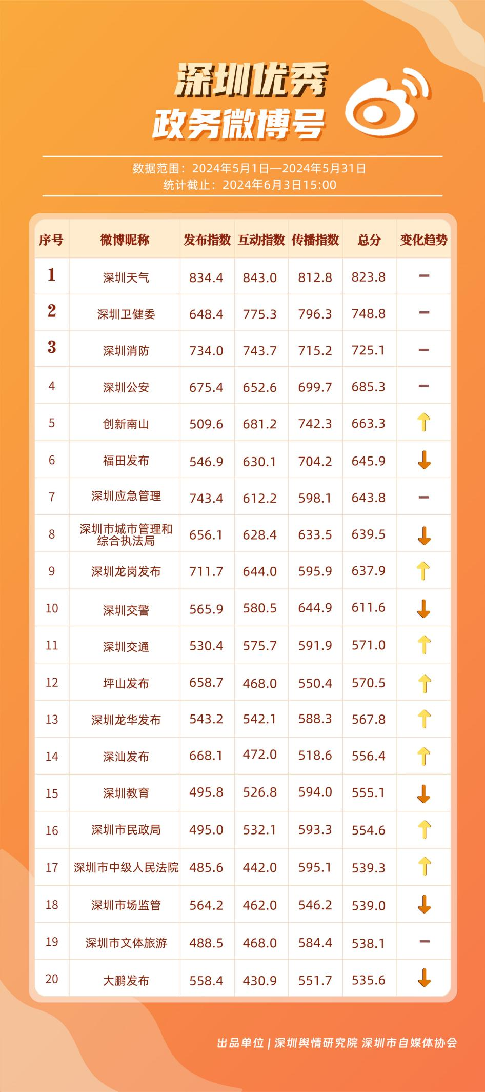 5月,“深圳天氣”“深圳衛(wèi)健委”“深圳消防”“深圳公安”“創(chuàng)新南山”“福田發(fā)布”“深圳應(yīng)急管理”“深圳市城市管理和綜合執(zhí)法局”“深圳龍崗發(fā)布”“深圳交警”等20個政務(wù)微博號入列“優(yōu)秀”名單。對比上期來看,“深圳天氣”“深圳衛(wèi)健委”“深圳消防”“深圳公安”發(fā)揮穩(wěn)定,能夠合理利用微博傳播渠道,持續(xù)輸出受眾喜聞樂見的高質(zhì)量內(nèi)容,“創(chuàng)新南山”“深圳龍崗發(fā)布”等微博號則在5月發(fā)力宣傳,整體傳播效果有所提升,收獲網(wǎng)民好評。