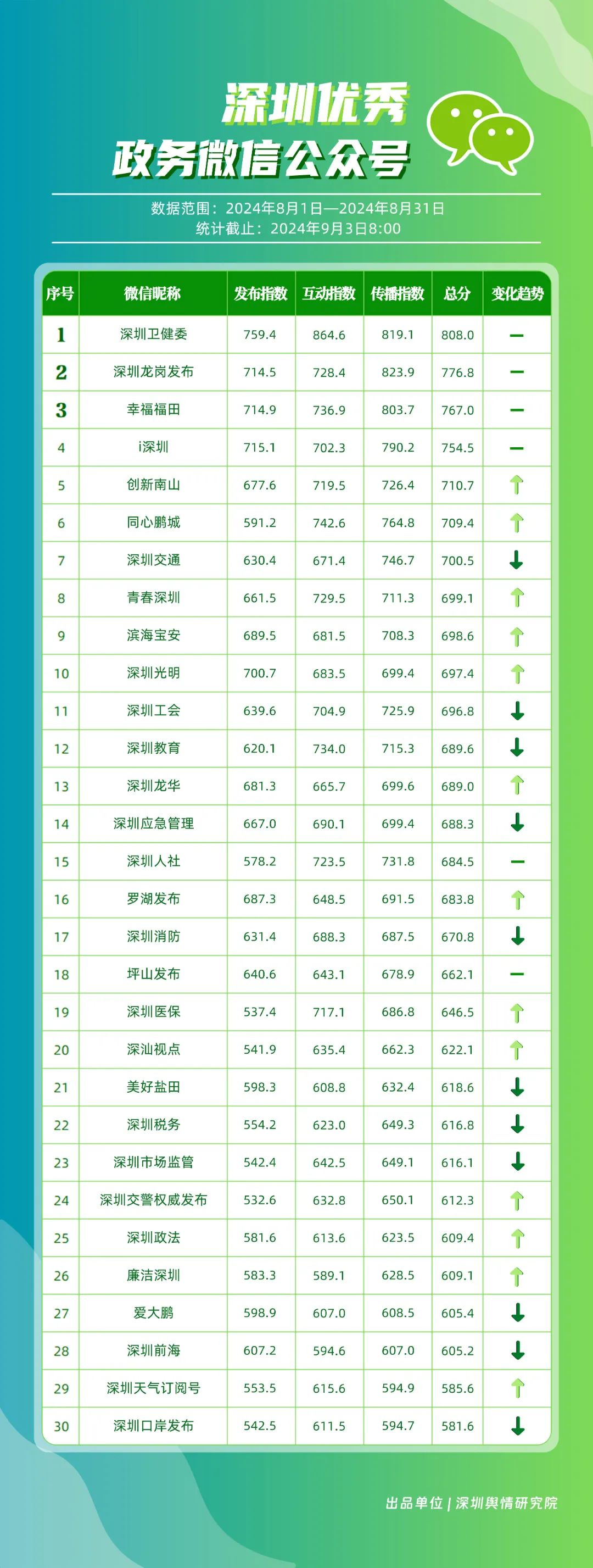 8月,“深圳衛(wèi)健委”“深圳龍崗發(fā)布”“幸福福田”“i深圳”“創(chuàng)新南山”“同心鵬城”“深圳交通”“青春深圳”“濱海寶安”“深圳光明”等30個賬號入選“深圳優(yōu)秀政務(wù)微信公眾號”。其中,榜單前四名的“深圳衛(wèi)健委”“深圳龍崗發(fā)布”“幸福福田”“i深圳”以其高質(zhì)量的內(nèi)容和有效的信息傳播策略,持續(xù)獲得公眾較高關(guān)注度,排名未產(chǎn)生變動。緊隨其后的“創(chuàng)新南山”“同心鵬城”“深圳交通”等賬號也在內(nèi)容風(fēng)格、質(zhì)量等方面展現(xiàn)了非凡的實力,獲得了積極反響。