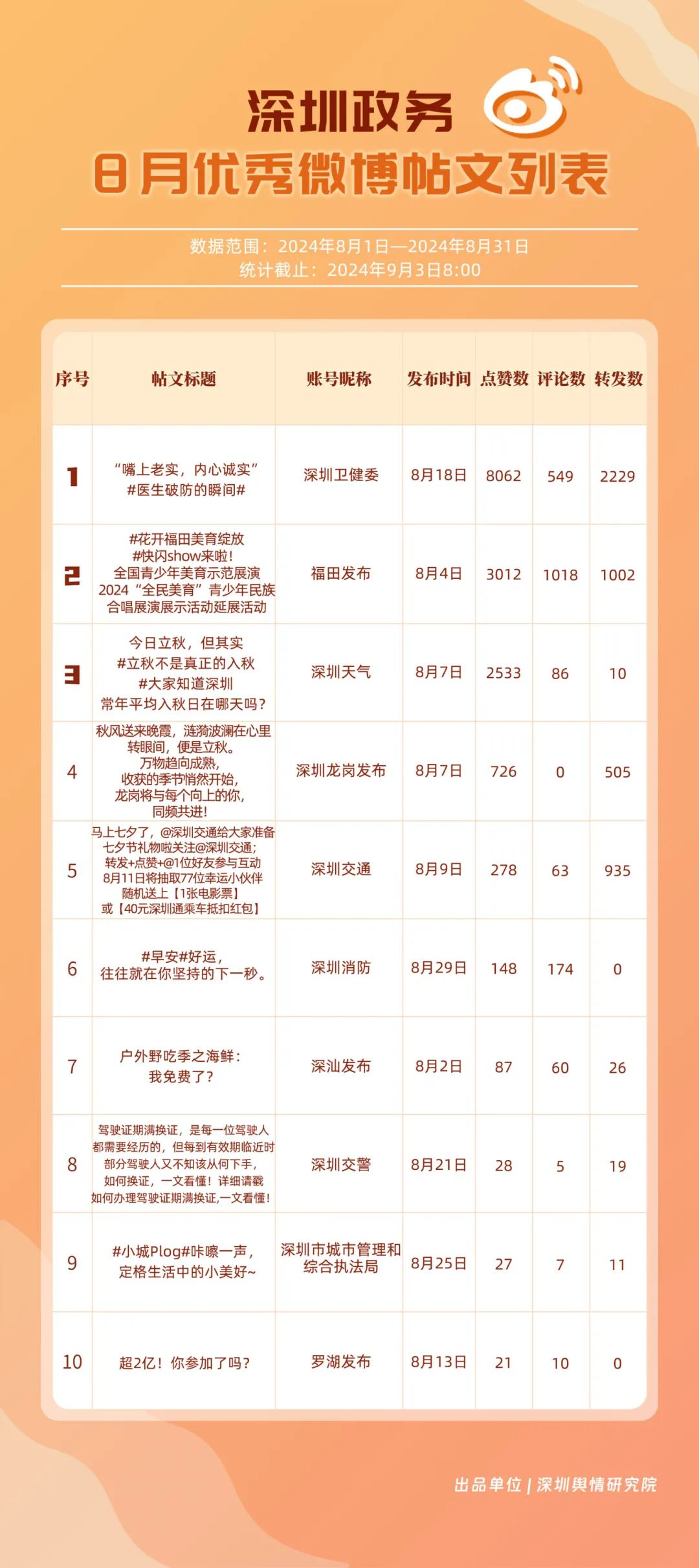 8月,“深圳天氣”“深圳衛(wèi)健委”“深圳消防”“福田發(fā)布”“深圳交警”“深圳龍崗發(fā)布”“深圳應(yīng)急管理”“深圳公安”“深圳交通”“深圳市城市管理和綜合執(zhí)法局”等20個政務(wù)微博號發(fā)布高質(zhì)量信息,入選優(yōu)秀政務(wù)微博號。其中,“深圳天氣”“深圳衛(wèi)健委”持續(xù)保持領(lǐng)先地位;“深圳消防”“福田發(fā)布”“深圳交警”等賬號有效優(yōu)化發(fā)布內(nèi)容和互動策略,排名有所提升。