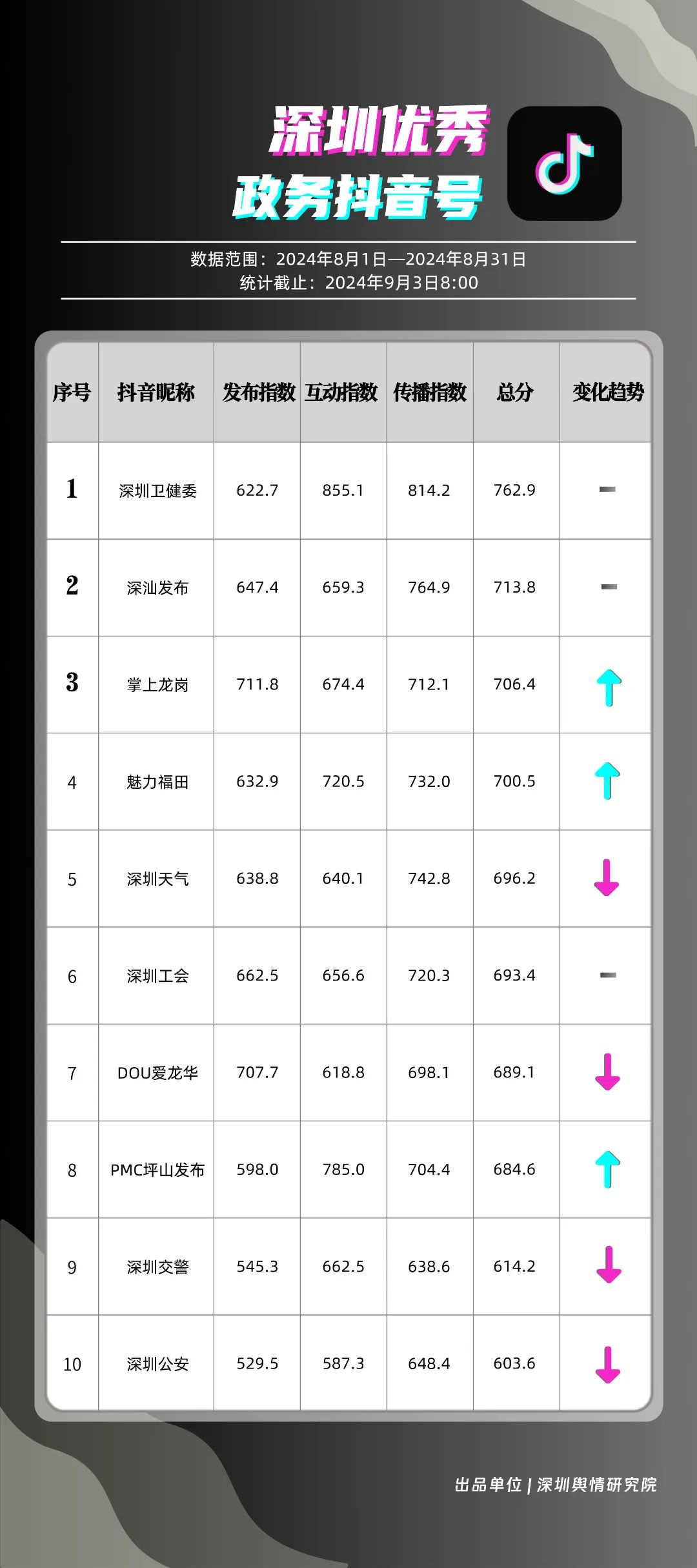 8月,“深圳衛(wèi)健委”“深汕發(fā)布”“掌上龍崗”“魅力福田”“深圳天氣”“深圳工會”“DOU愛龍華”“PMC坪山發(fā)布”“深圳交警”和“深圳公安”共10個政務(wù)抖音號獲得優(yōu)秀稱號,“深圳衛(wèi)健委”“深汕發(fā)布”“掌上龍崗”以高分居榜單前三,賬號有關(guān)“醫(yī)師節(jié)”“猴痘”“奧運金牌”的視頻獲得了較高的關(guān)注度和討論度,相關(guān)優(yōu)秀視頻在傳播信息的同時,也展現(xiàn)了深圳政務(wù)抖音號在內(nèi)容質(zhì)量、互動性和傳播度方面的實力。