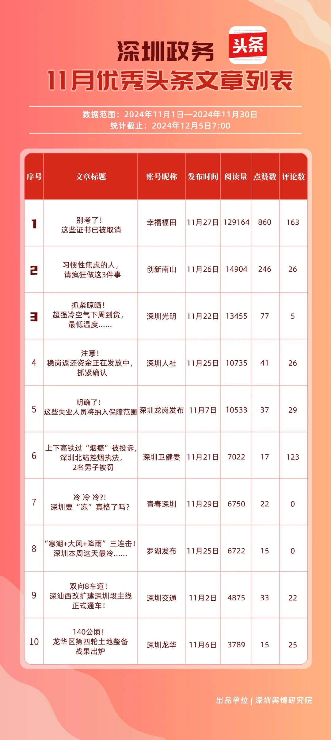11月,“幸福福田”“深圳龍崗發(fā)布”“創(chuàng)新南山”“深圳人社”“深圳龍華”“深圳光明”“濱海寶安”“坪山發(fā)布”“深圳衛(wèi)健委”“羅湖發(fā)布”共10個政務(wù)頭條號入選“優(yōu)秀政務(wù)頭條號”榜單。“幸福福田”發(fā)布大量民生相關(guān)信息,穩(wěn)居第一。“深圳龍崗發(fā)布”同樣表現(xiàn)不凡,排名始終位于前列,展現(xiàn)了其在信息傳播與政務(wù)服務(wù)方面的卓越能力。此外,賬號“創(chuàng)新南山”“深圳人社”“深圳龍華”“深圳光明”在榜單中的排名有所提升,為政務(wù)新媒體樹立了典范。