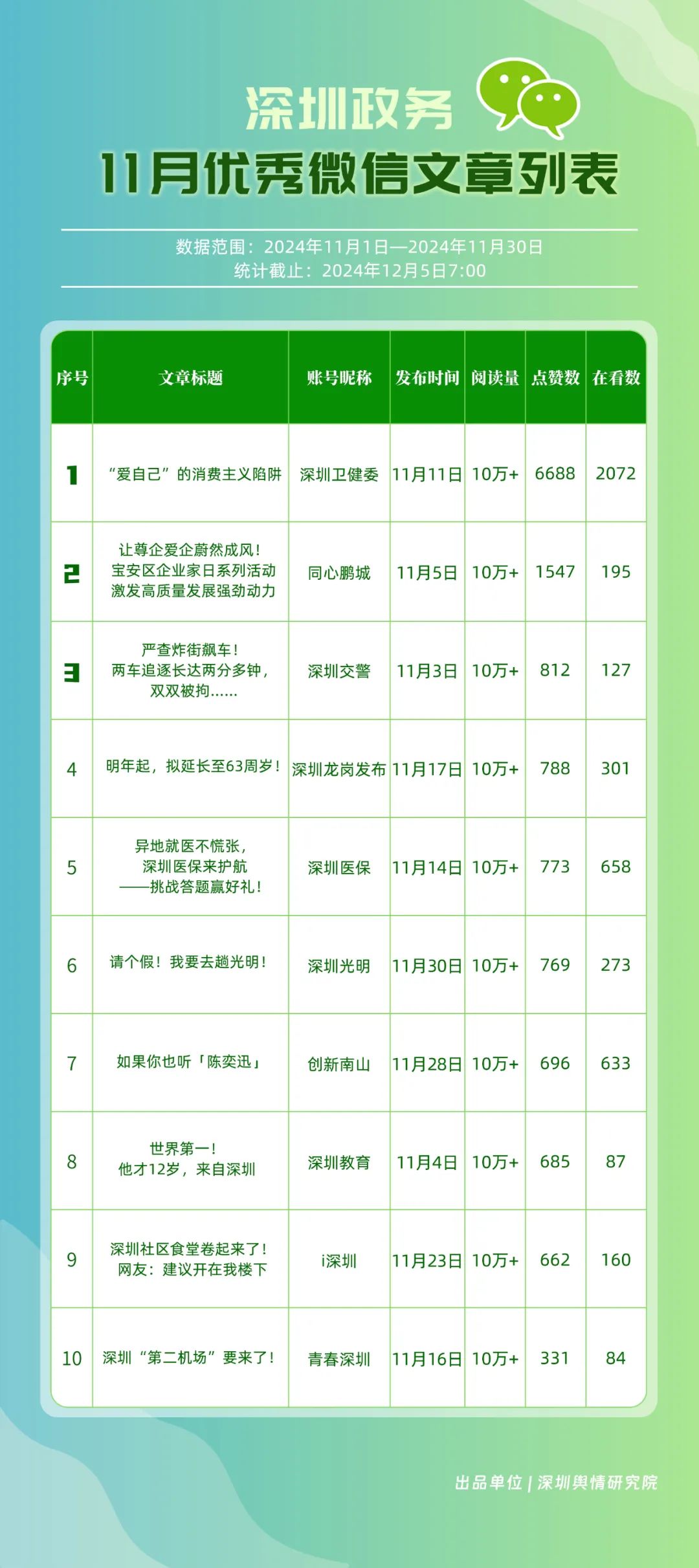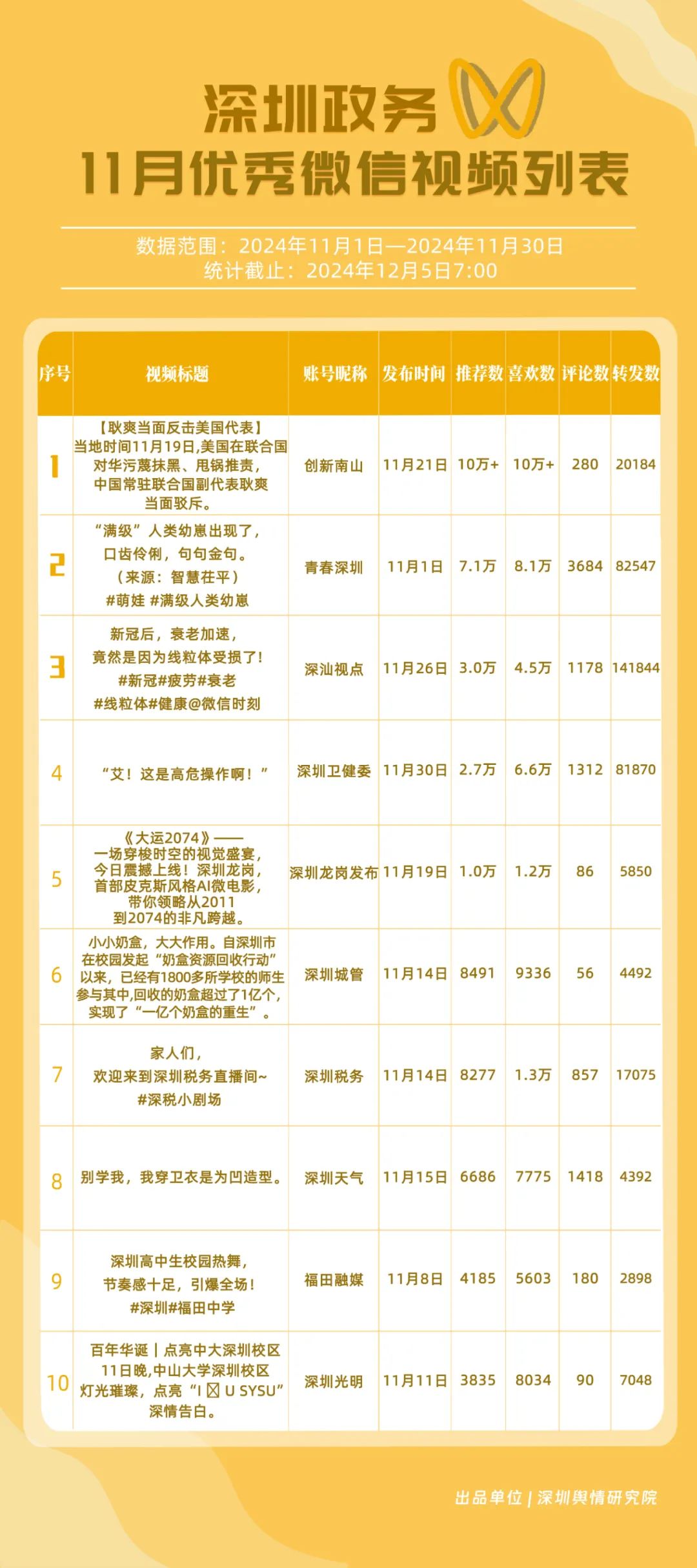 11月,獲“深圳優(yōu)秀政務(wù)微信視頻號”稱號的分別是“深汕視點”“青春深圳”“深圳衛(wèi)健委”“創(chuàng)新南山”“深圳龍崗發(fā)布”“福田融媒”“深圳教育”“深圳天氣”“深圳稅務(wù)”“深圳光明”。其中,“深汕視點”與“青春深圳”通過積極轉(zhuǎn)發(fā)涵蓋廣泛領(lǐng)域的優(yōu)質(zhì)視頻內(nèi)容,贏得了網(wǎng)民的廣泛點贊與推薦,彰顯了其在內(nèi)容聚合與傳播上的獨到之處?!吧钲谛l(wèi)健委”則專注于衛(wèi)生健康領(lǐng)域,發(fā)布了一系列高質(zhì)量的內(nèi)容,深受網(wǎng)民喜愛,進一步鞏固了其在健康傳播領(lǐng)域的領(lǐng)先地位。