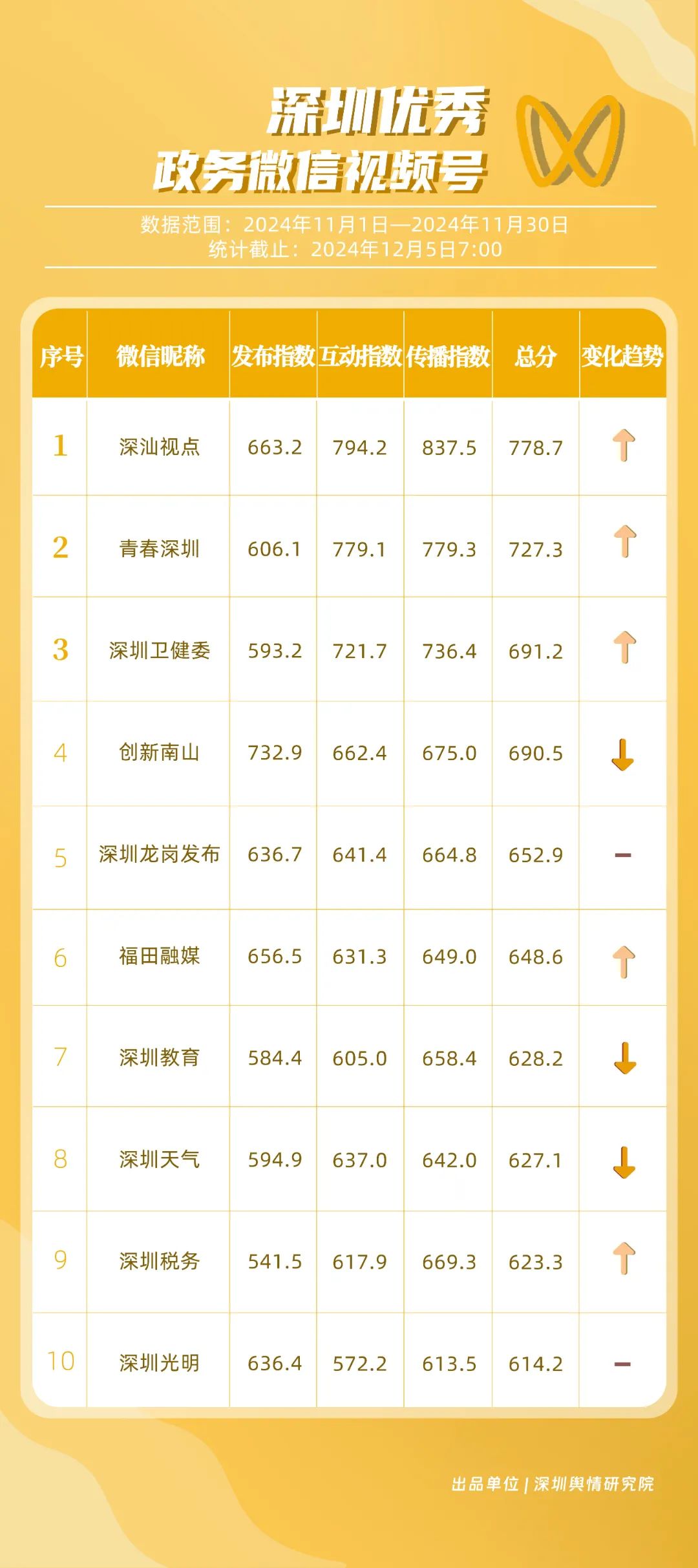 《深圳優(yōu)秀政務(wù)新媒體矩陣》將深圳黨政機關(guān)、企事業(yè)單位開設(shè)的政務(wù)公眾號(微信)、微博號、抖音號、視頻號(微信)及頭條號按照發(fā)布指數(shù)、互動指數(shù)、傳播指數(shù)三項指標(biāo)進行綜合評價,最終形成優(yōu)秀名單。