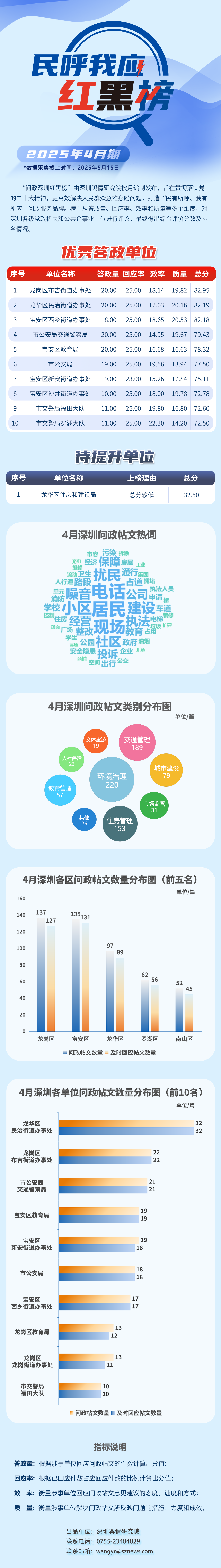 本期榜單采集的帖文主要來自深圳市及各區(qū)政府官網(wǎng)、深圳論壇、人民網(wǎng)領(lǐng)導(dǎo)留言板、深圳新聞網(wǎng)“民呼我應(yīng)”等平臺,所采集帖文發(fā)布時間為2025年4月1日至4月30日,采集截止時間為2025年5月15日。