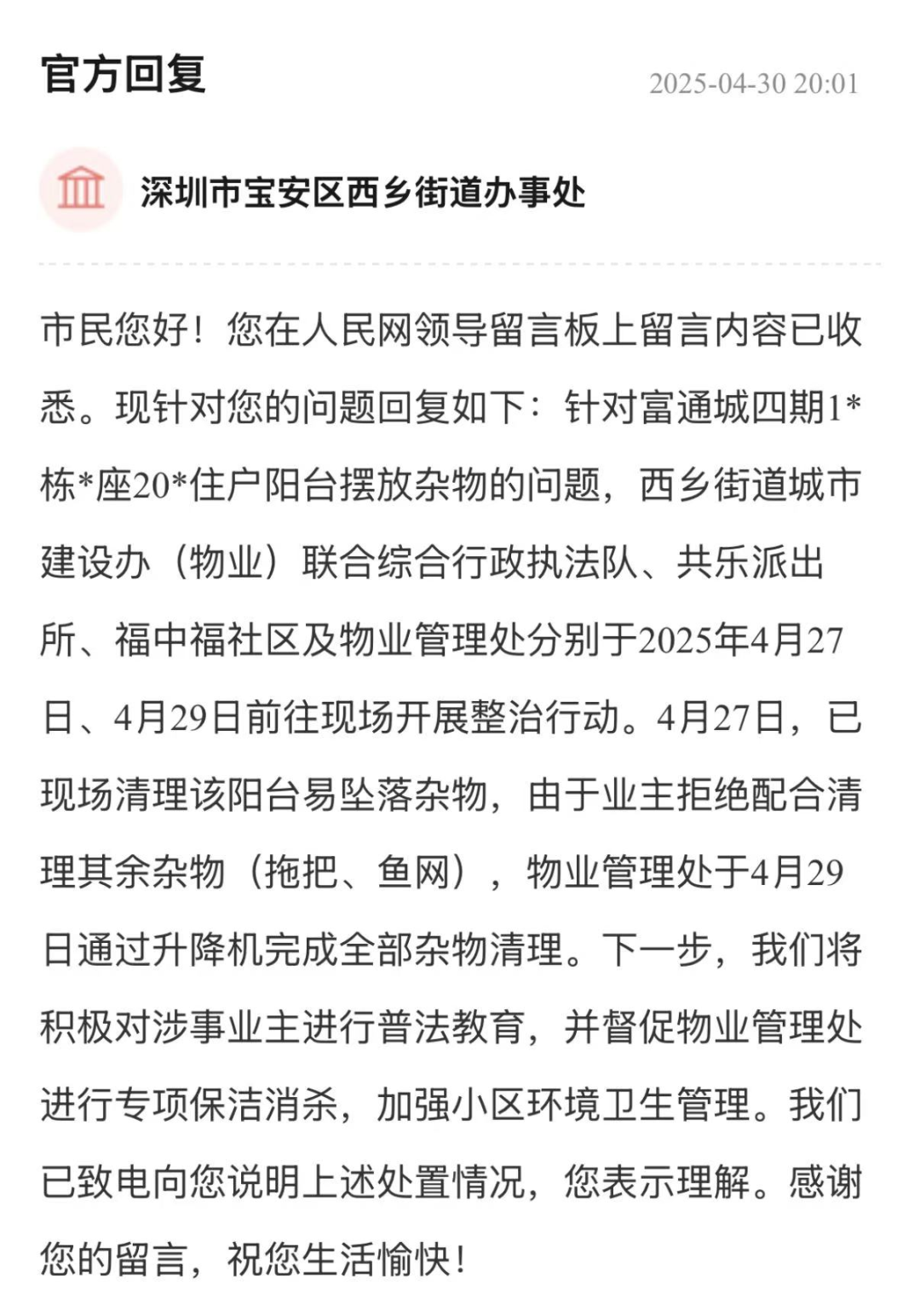 陽臺懸掛雜物影響居住環(huán)境問題,關(guān)乎社區(qū)環(huán)境品質(zhì)與鄰里和諧,街道辦聯(lián)動多部門快速響應(yīng),面對業(yè)主不配合的情況,以“柔性溝通+硬性執(zhí)行”破解處置難點。后續(xù)計劃的普法教育、保潔消殺則構(gòu)建了“整治-教育-長效”管理方式,守護(hù)了居民居住環(huán)境整潔,更彰顯“民有所呼、事必快辦”的基層治理擔(dān)當(dāng)。