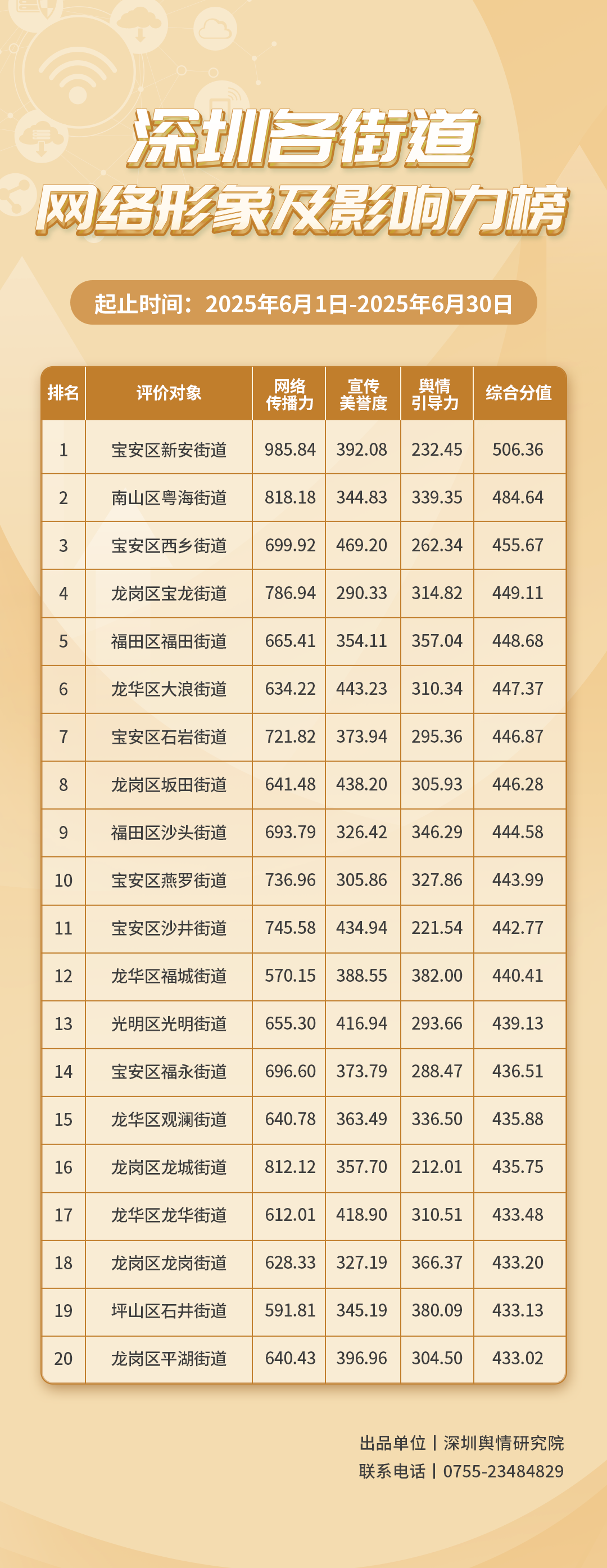 為深入了解深圳市各街道的網(wǎng)絡(luò)形象構(gòu)建狀況和社會(huì)影響,推動(dòng)街道治理“提質(zhì)增效”,增強(qiáng)城市高質(zhì)量發(fā)展動(dòng)能,深圳輿情研究院編制推出《深圳各街道網(wǎng)絡(luò)形象及影響力榜》。榜單具有獨(dú)立客觀的評(píng)價(jià)體系,通過數(shù)據(jù)采集和分析,評(píng)估各街道的網(wǎng)絡(luò)傳播力、宣傳美譽(yù)度及輿情引導(dǎo)力,并對(duì)全市11個(gè)區(qū)共78個(gè)街道的網(wǎng)絡(luò)形象及影響力進(jìn)行綜合排名。