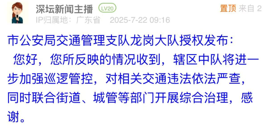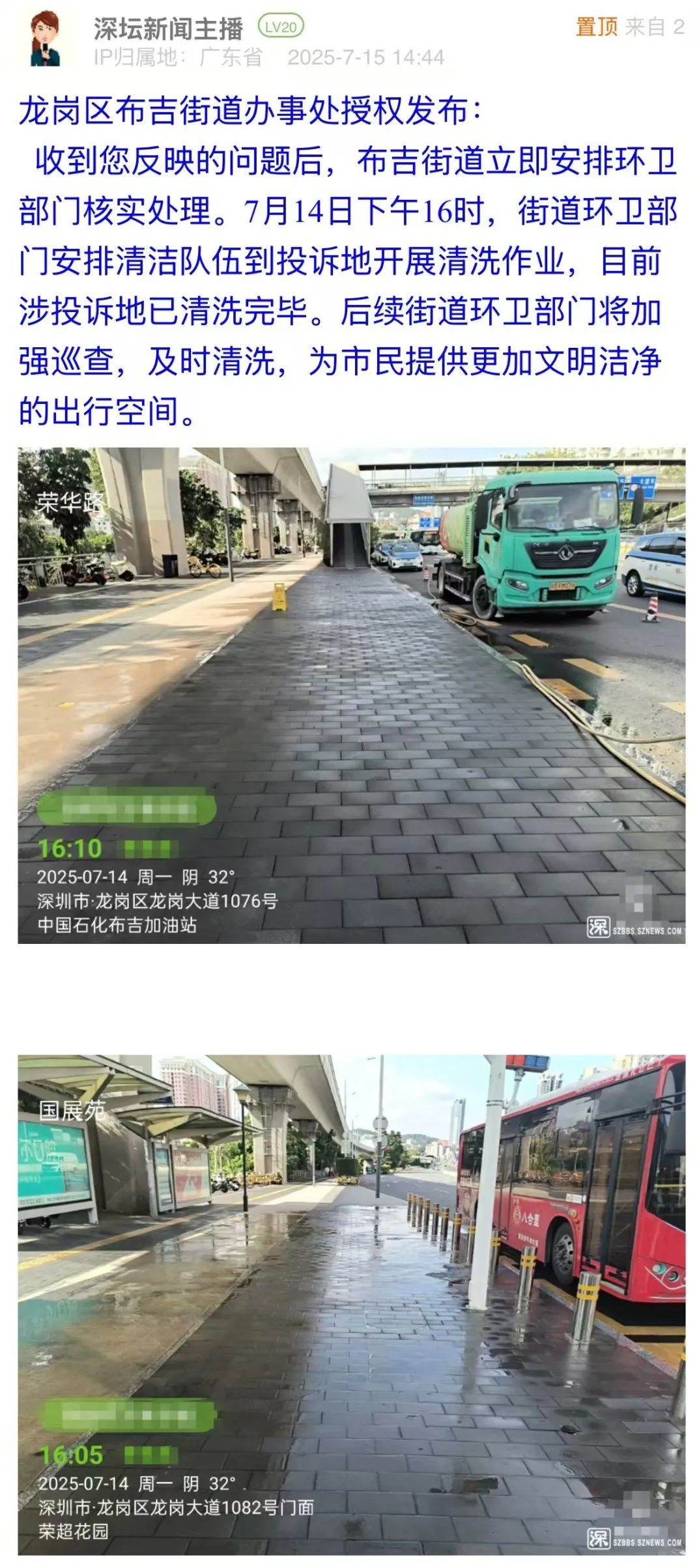 案例點評:對于市民反映的路面油污問題,布吉街道辦立即安排環(huán)衛(wèi)部門進行清洗,并于第二日在問政帖文下進行回復,以現(xiàn)場圖片展示路面清理效果,表示將加強后續(xù)巡查。此次處置展現(xiàn)了基層部門高效務實的問題處理能力,為城市道路環(huán)境管理提供了快速響應與長效維護相結合的實踐范例,切實回應了市民對潔凈環(huán)境的期待。