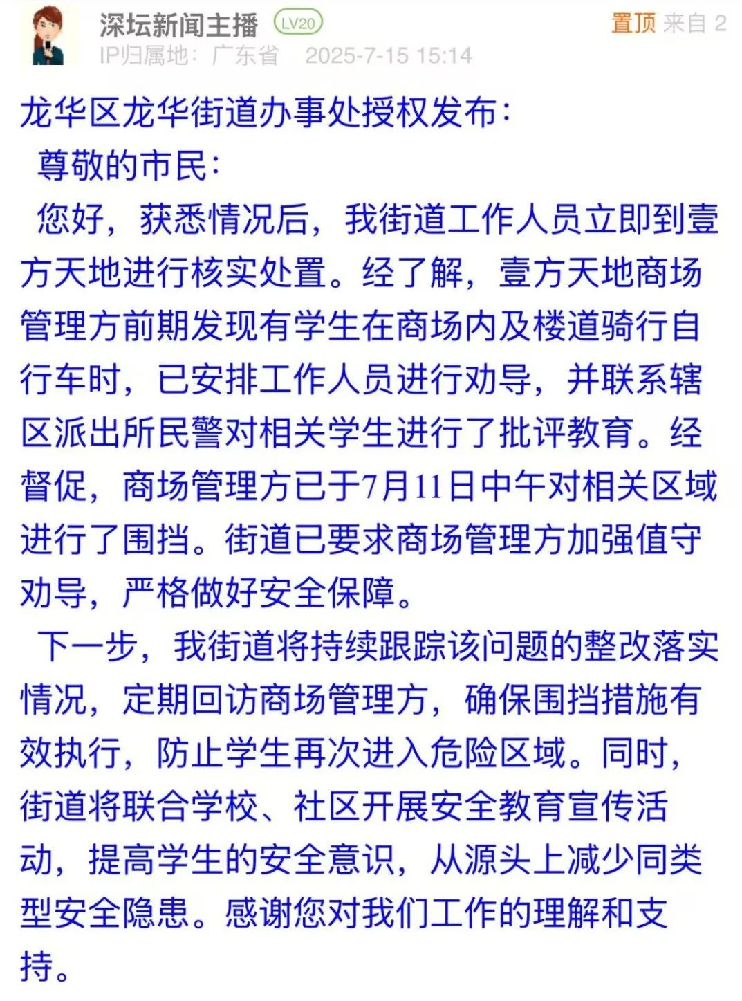 面對商場內(nèi)學生的騎行安全隱患,龍華街道辦迅速啟動應急處置機制,經(jīng)現(xiàn)場核實后,通過區(qū)域圍擋和批評教育及時控制風險,并強化商場值守。處置過程中既采取即時管控手段,又推動建立學校、社區(qū)聯(lián)動的安全教育長效機制,為公共場所中未成年人行為的規(guī)范管理提供了務實有效的解決方案。