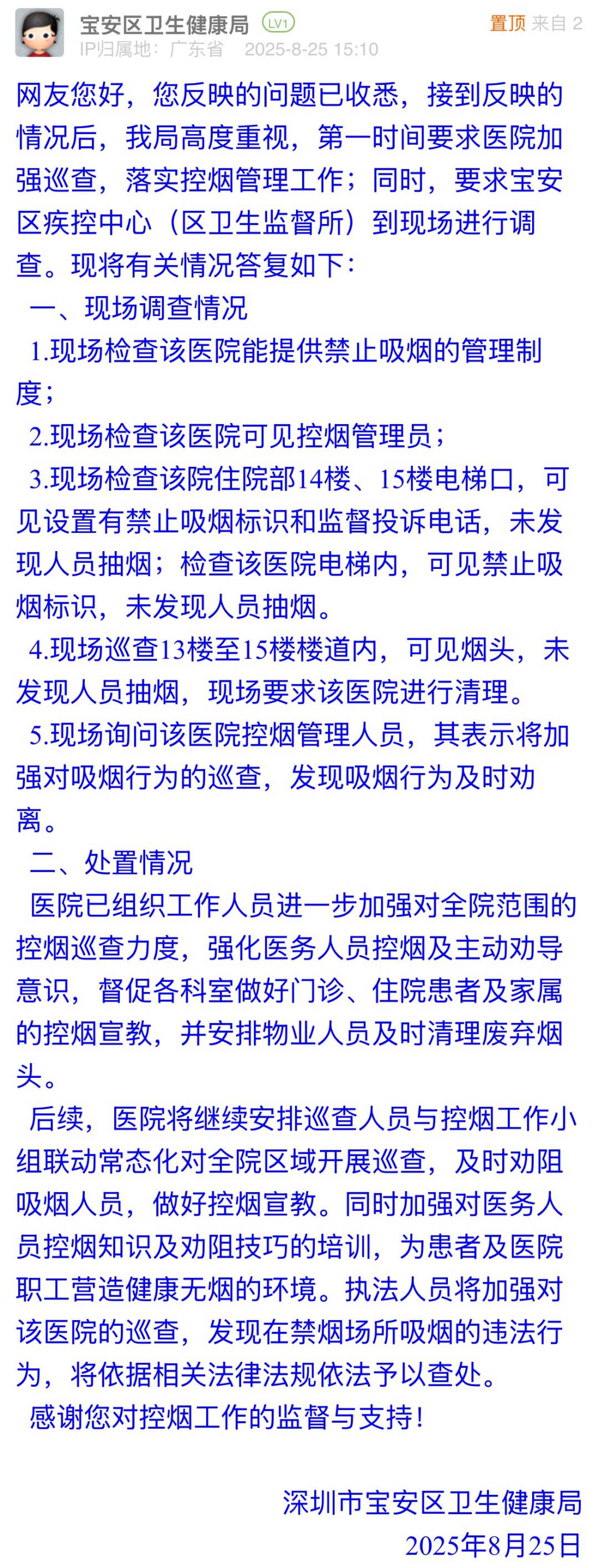 優(yōu)化建議:接到市民反饋后,寶安區(qū)衛(wèi)生健康局快速組織現(xiàn)場(chǎng)調(diào)查,核實(shí)醫(yī)院有禁煙制度、控?zé)煿芾韱T在崗,基礎(chǔ)控?zé)煷胧┖瞬榈轿?,值得點(diǎn)贊。但回應(yīng)中多次強(qiáng)調(diào)“未發(fā)現(xiàn)人員抽煙”,回避對(duì)歷史吸煙行為處置、煙頭來源及勸阻機(jī)制失效的解釋,與市民關(guān)切脫節(jié),難以消除市民對(duì)醫(yī)院日???zé)熌芰Φ膿?dān)憂,建議完善具體控?zé)煷胧?,如加裝煙感報(bào)警裝置,建立核查公示制度等,筑牢“無煙醫(yī)院”防線。